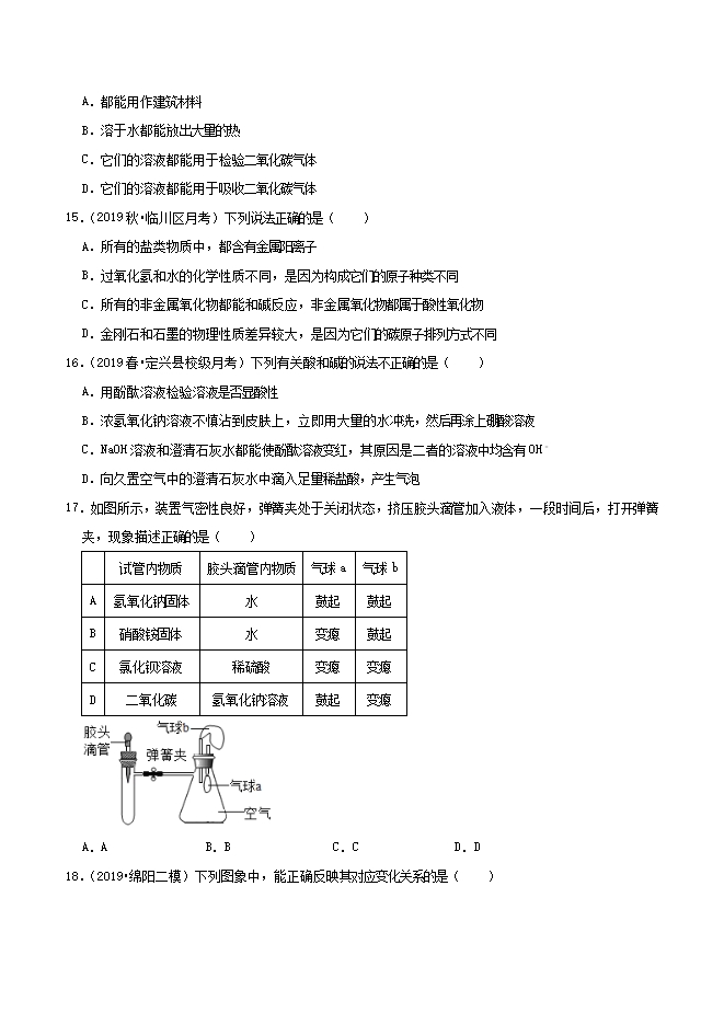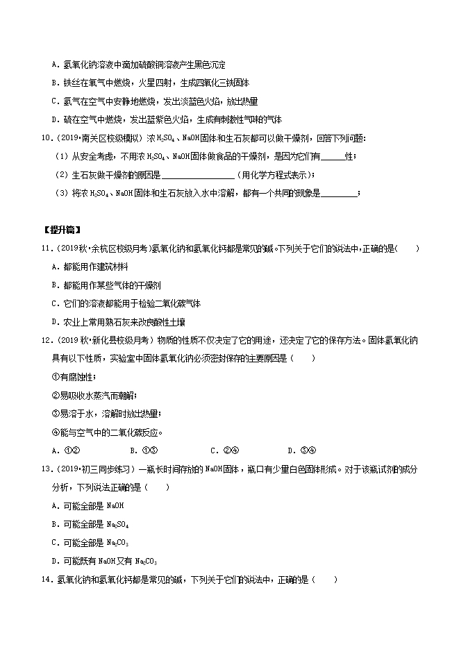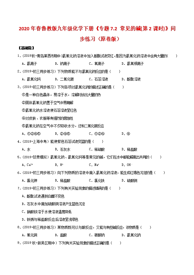 2020年春鲁教版九年级化学下册《专题7.2 常见的碱(第2课时)》同步练习(原卷版)