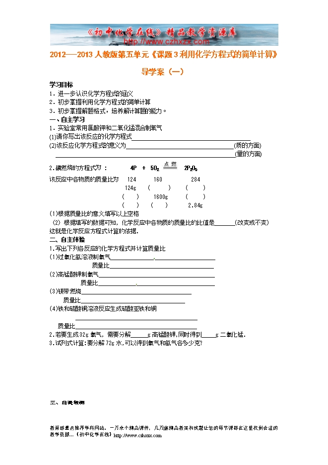2012---2013人教版第五单元《课题3 利用化学方程式的简单计算》导学案(一)