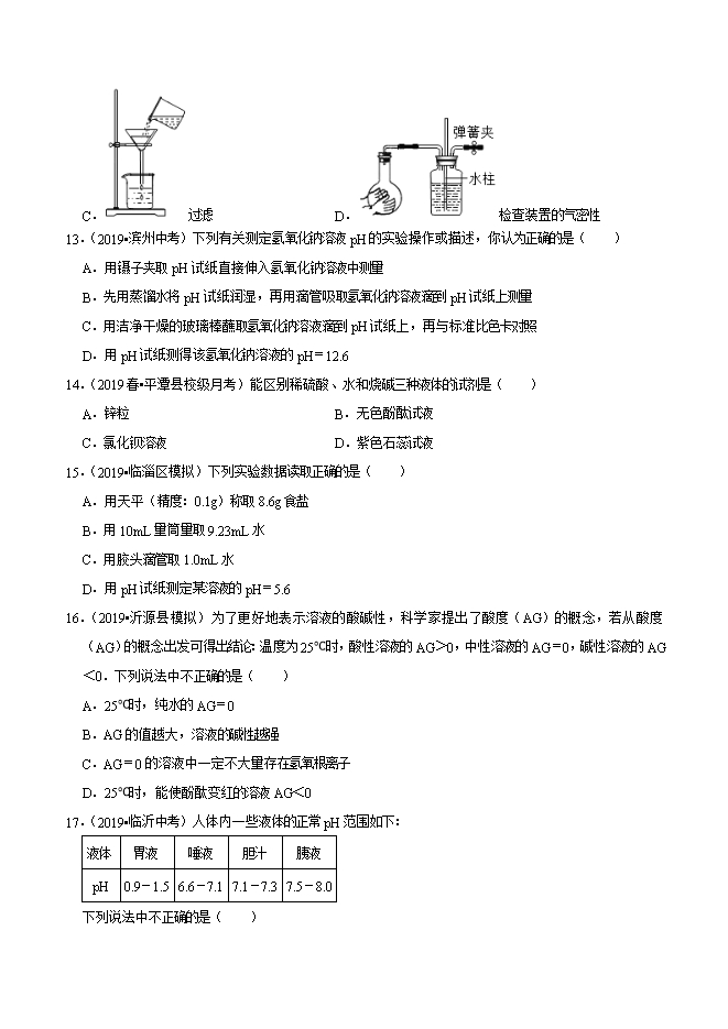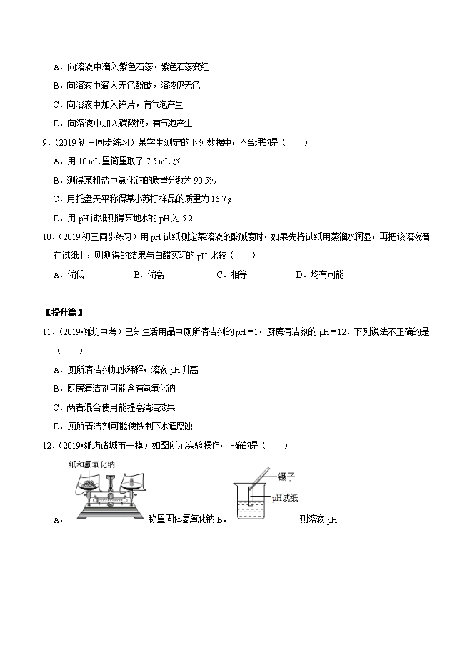 【内容简介】下列说法正确是( )A.用湿润的pH试纸测定稀硫酸的pHB.用干燥的pH试纸测定浓硫酸的pHC.用干燥的pH试纸测定二氧化碳气体的pHD.用干燥的pH试纸测定氢氧化钠稀溶液的pH5.(2019初三同步练习)下列溶液碱性最强的是( )A.pH=0的溶液B.pH=1的溶液C.pH=7的溶液D.pH=14的溶液6.(2019青岛市•市中区二模)下列实验操作正确的是( )A.实验结束后剩余的药品放入原瓶B.将 pH 试纸伸入碳酸钾溶液中测 pH 值C.用燃着的酒精灯点燃另一盏酒精灯D.给液体加热时,试管口不可以朝向自己和他人7.(2019初三同步练习)在pH=3的溶液中,加入石蕊试液或者酚酞试液所呈现的颜色分别是( )A.红色,红色B.蓝色,红色C.红色,无色D.蓝色,无色8.(2019初三同步练习)下列现象不能说明某溶液显酸性的是( )......