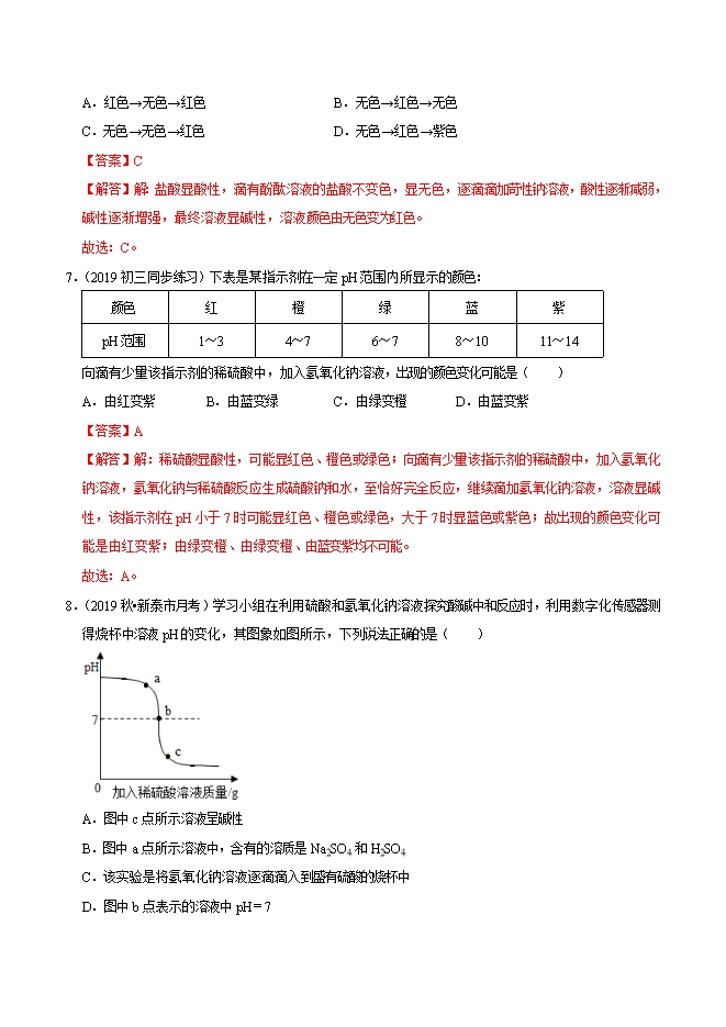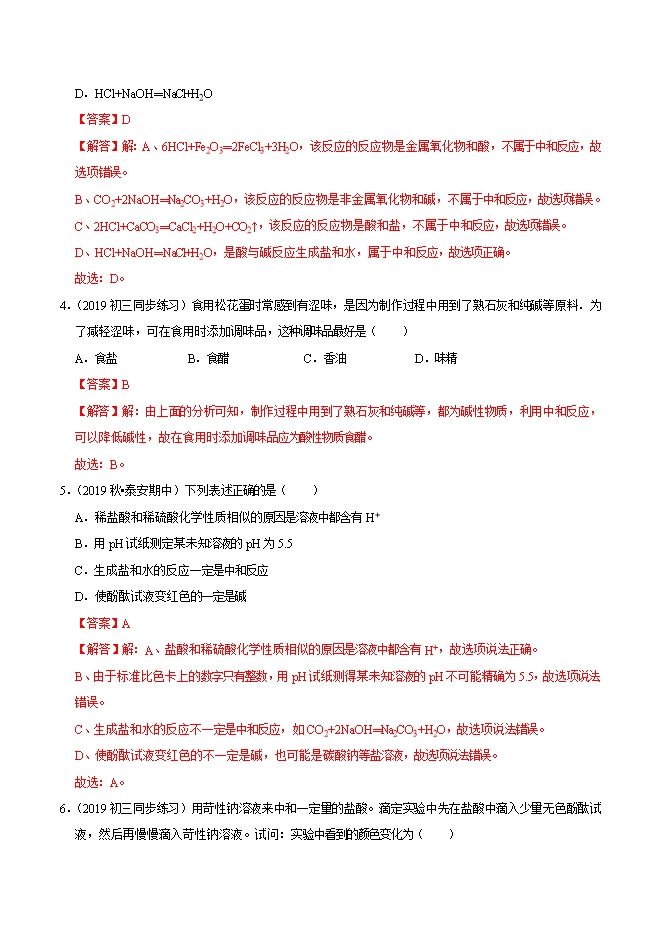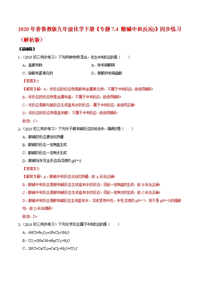 【内容简介】下列两种物质混合,发生中和反应的是( )A.盐酸和铁B.铁和硫酸铜C.硫酸和氢氧化钠D.碳酸钠和稀盐酸【答案】C【解答】解:A、该反应的反应物是酸和金属氧化物,不属于中和反应,故选项错误;B、该反应的反应物是金属和盐,不属于中和反应,故选项错误;C、该反应是酸与碱反应生成盐和水的反应,属于中和反应,故选项正确;D、该反应的反应物是盐和酸,不属于中和反应,故选项错误。故选:C。2.(2019初三同步练习)下列关于酸和碱反应的说法中,错误的是( )A.酸碱的反应要放出热量B.酸碱的反应一定有盐生成C.酸碱的反应一定有水生成D.酸碱恰好完全反应后溶液的pH=0【答案】D【解答】解;A、酸碱中和反应会放出热量,故A说法正确;B、酸碱中和反应是酸和碱反应生成盐和水的反应,因此一定有盐的生成,故B说法正确;C、酸碱中和反应是酸和碱反应生成盐和水的反应,因此一定有水的生成,故C说法正确;D、酸碱中和反应是酸和碱反应生成盐和水,溶液呈现中性,中性溶液的pH=7,而不是pH=0的强酸性,故D说法错误;故选:D。......