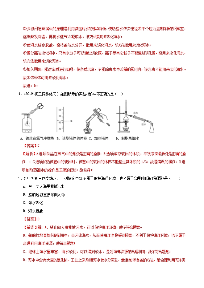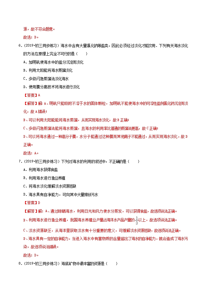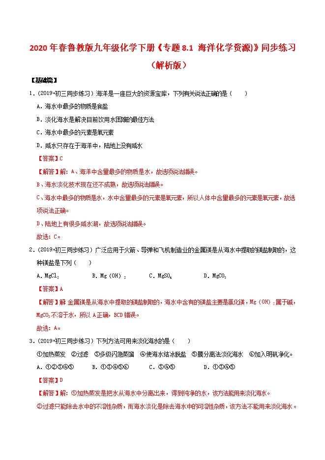 【内容简介】海洋是一座巨大的资源宝库,下列有关说法正确的是( )A.海水中最多的物质是食盐B.淡化海水是解决目前饮用水困难的最佳方法C.海水中最多的元素是氧元素D.咸水只存在于海洋中,陆地上没有咸水【答案】C【解答】解:A、海洋中含量最多的物质是水,故选项说法错误。B、海水淡化技术现在还不成熟,故选项说法错误。C、海水中最多的物质是水,水中含量最多的元素是氧元素,所以人体中含量最多的元素是氧元素,故选项说法正确。D、陆地上有很多咸水湖,故选项说法错误。故选:C。2.(2019•初三同步练习)广泛应用于火箭、导弹和飞机制造业的金属镁是从海水中提取的镁盐制取的,这种镁盐是下列( )A.MgCl2B.Mg(OH)2C.MgSO4D.MgCO3【答案】A【解答】解:金属镁是从海水中提取的镁盐制取的,海水中含有的镁盐主要是氯化镁,Mg(OH)2属于碱,MgCO3不溶于水,所以A正确,BCD错误。故选:A。3.(2019•初三同步练习)下列方法可用来淡化海水的是( )①加热蒸发 ②过滤 ③多级闪急蒸馏 ④使海水结冰脱盐 ⑤膜分离法淡化海水 ⑥加入明矾净化。A.①②③④⑤B.①③④⑤⑥C.③④⑤D.①③④⑤......