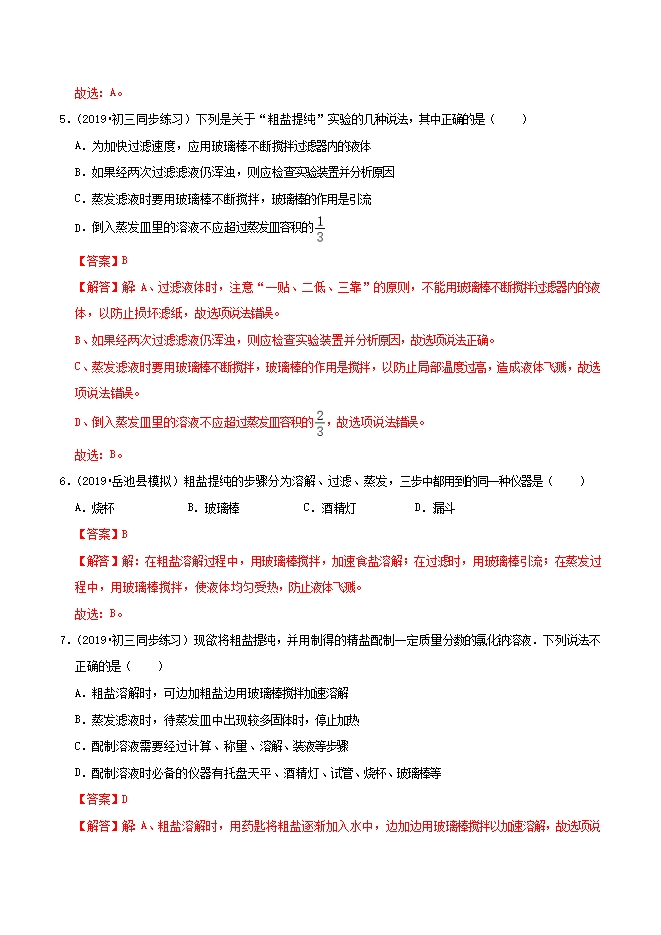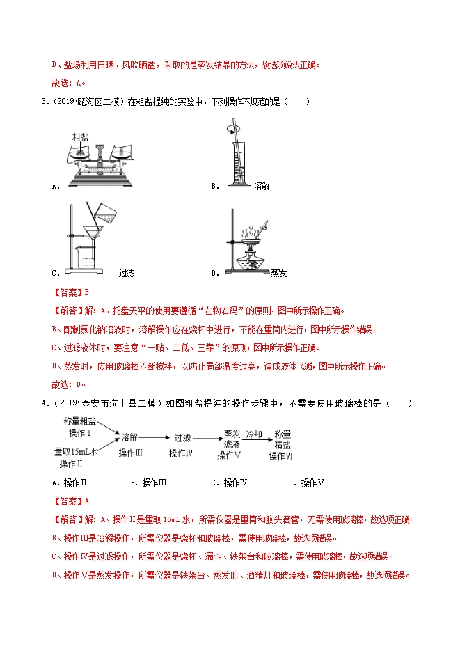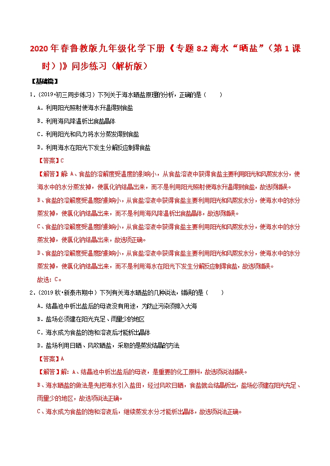 【内容简介】下列关于海水晒盐原理的分析,正确的是( )A.利用阳光照射使海水升温得到食盐B.利用海风降温析出食盐晶体C.利用阳光和风力将水分蒸发得到食盐D.利用海水在阳光下发生分解反应制得食盐【答案】C【解答】解:A、食盐的溶解度受温度的影响小,从食盐溶液中获得食盐主要利用阳光和风蒸发水分,使海水中的水分蒸发掉,使氯化钠结晶出来,而不是利用阳光照射使海水升温得到食盐,故选项错误。B、食盐的溶解度受温度的影响小,从食盐溶液中获得食盐主要利用阳光和风蒸发水分,使海水中的水分蒸发掉,使氯化钠结晶出来,而不是利用海风降温析出食盐晶体,故选项错误。C、食盐的溶解度受温度的影响小,从食盐溶液中获得食盐主要利用阳光和风蒸发水分,使海水中的水分蒸发掉,使氯化钠结晶出来,故选项正确。D、食盐的溶解度受温度的影响小,从食盐溶液中获得食盐主要利用阳光和风蒸发水分,使海水中的水分蒸发掉,使氯化钠结晶出来,而不是利用海水在阳光下发生分解反应制得食盐,故选项错误。故选:C。2.(2019秋•新泰市期中)下列有关海水晒盐的几种说法,错误的是( )A.结晶池中析出盐后的母液没有用途,为防止污染须排入大海......