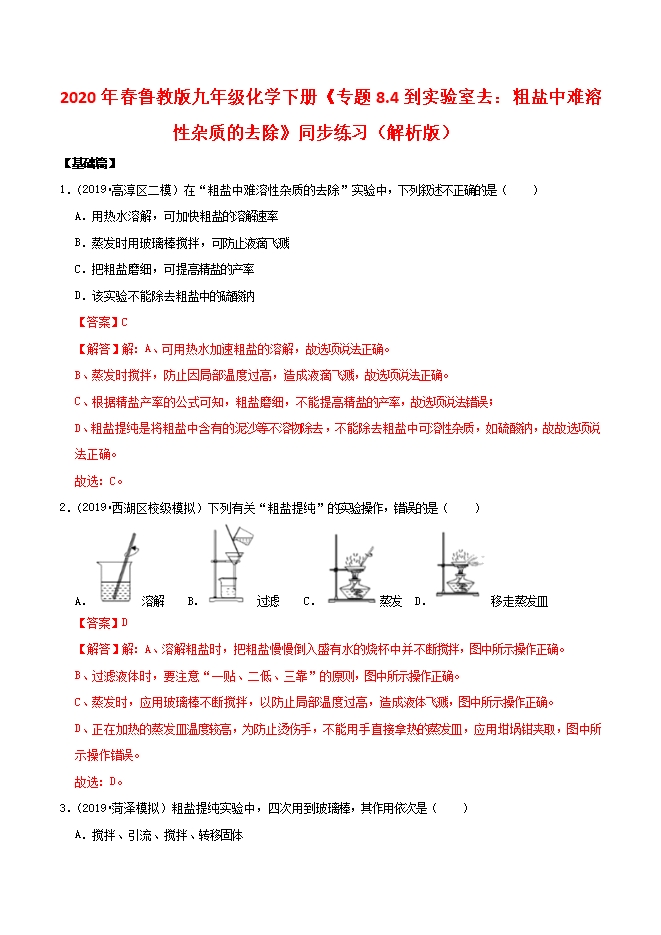 2020年春鲁教版九年级化学下册《专题8.4到实验室去:粗盐中难溶性杂质的去除》同步练习(解析版)
