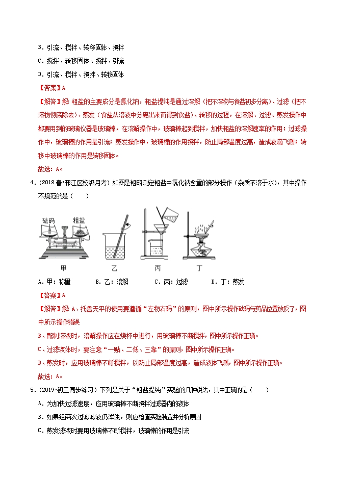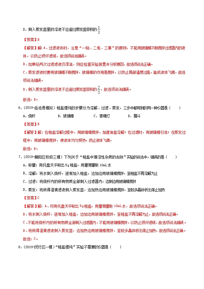 【内容简介】在“粗盐中难溶性杂质的去除”实验中,下列叙述不正确的是( )A.用热水溶解,可加快粗盐的溶解速率B.蒸发时用玻璃棒搅拌,可防止液滴飞溅C.把粗盐磨细,可提高精盐的产率D.该实验不能除去粗盐中的硫酸钠【答案】C【解答】解:A、可用热水加速粗盐的溶解,故选项说法正确。B、蒸发时搅拌,防止因局部温度过高,造成液滴飞溅,故选项说法正确。C、根据精盐产率的公式可知,粗盐磨细,不能提高精盐的产率,故选项说法错误;D、粗盐提纯是将粗盐中含有的泥沙等不溶物除去,不能除去粗盐中可溶性杂质,如硫酸钠,故故选项说法正确。故选:C。2.(2019•西湖区校级模拟)下列有关“粗盐提纯”的实验操作,错误的是( )......