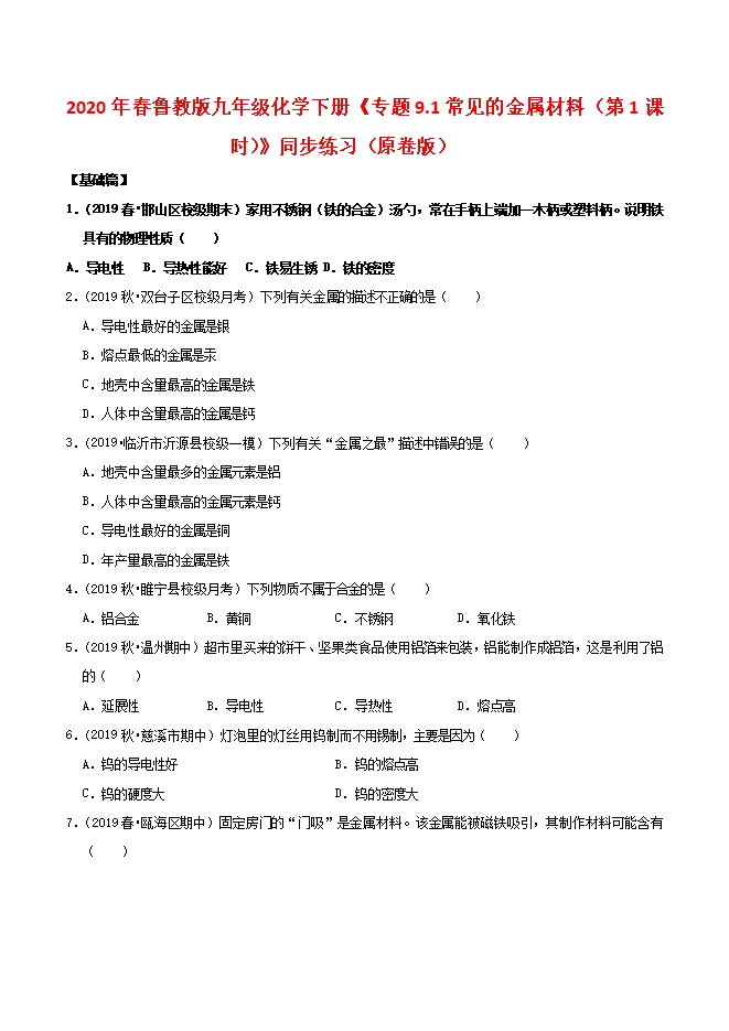 2020年春鲁教版九年级化学下册《专题9.1常见的金属材料(第1课时)》同步练习(原卷版)