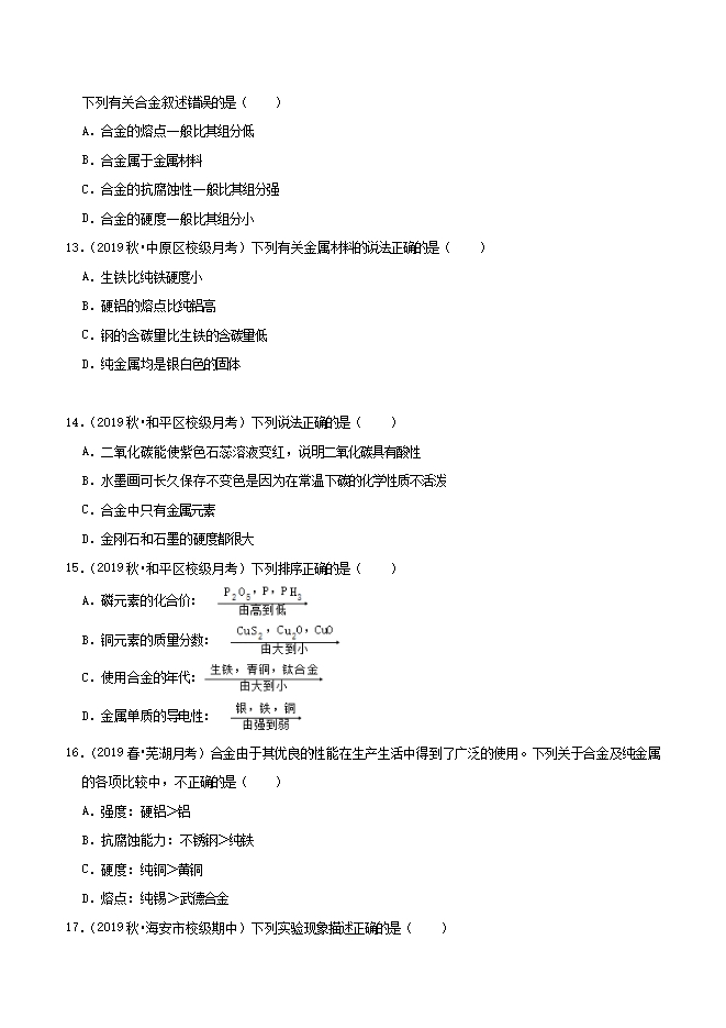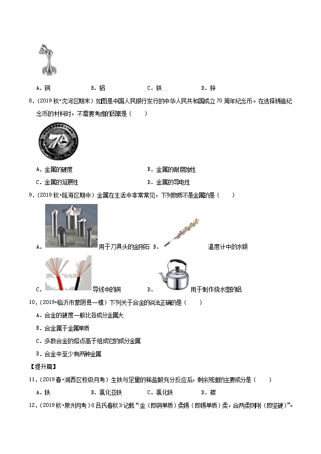 【内容简介】下列有关“金属之最”描述中错误的是( )A.地壳中含量最多的金属元素是铝B.人体中含量最高的金属元素是钙C.导电性最好的金属是铜D.年产量最高的金属是铁4.(2019秋•睢宁县校级月考)下列物质不属于合金的是( )A.铝合金B.黄铜C.不锈钢D.氧化铁5.(2019秋•温州期中)超市里买来的饼干、坚果类食品使用铝箔来包装,铝能制作成铝箔,这是利用了铝的( )A.延展性B.导电性C.导热性D.熔点高6.(2019秋•慈溪市期中)灯泡里的灯丝用钨制而不用锡制,主要是因为( )A.钨的导电性好B.钨的熔点高C.钨的硬度大D.钨的密度大7.(2019春•瓯海区期中)固定房门的“门吸”是金属材料。该金属能被磁铁吸引,其制作材料可能含有( )......