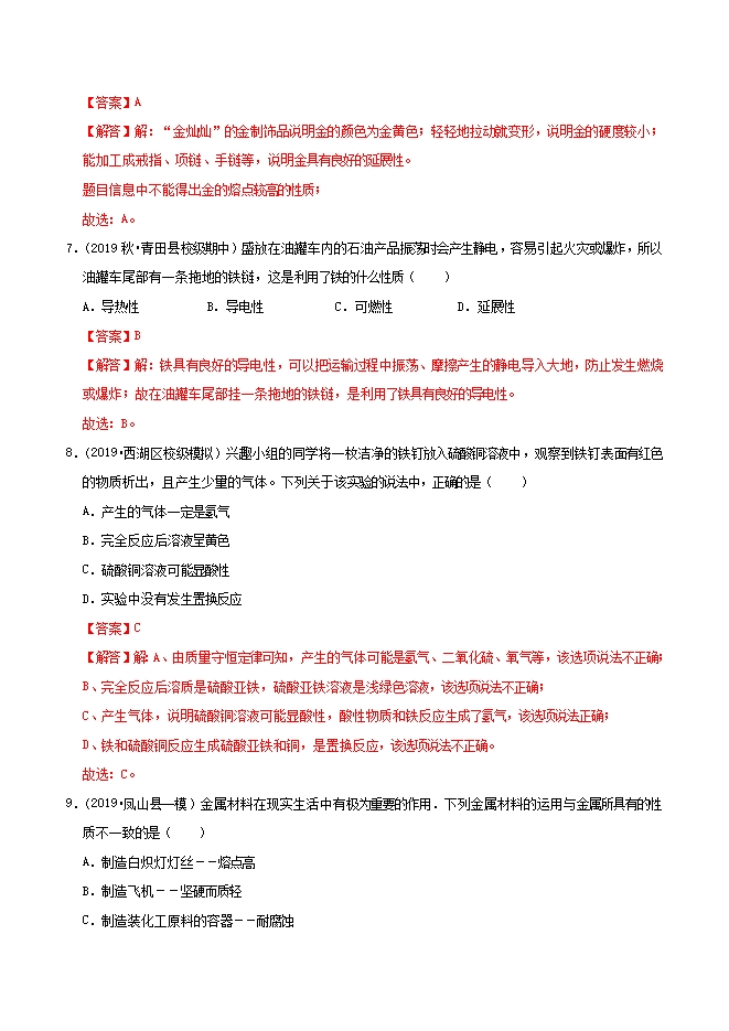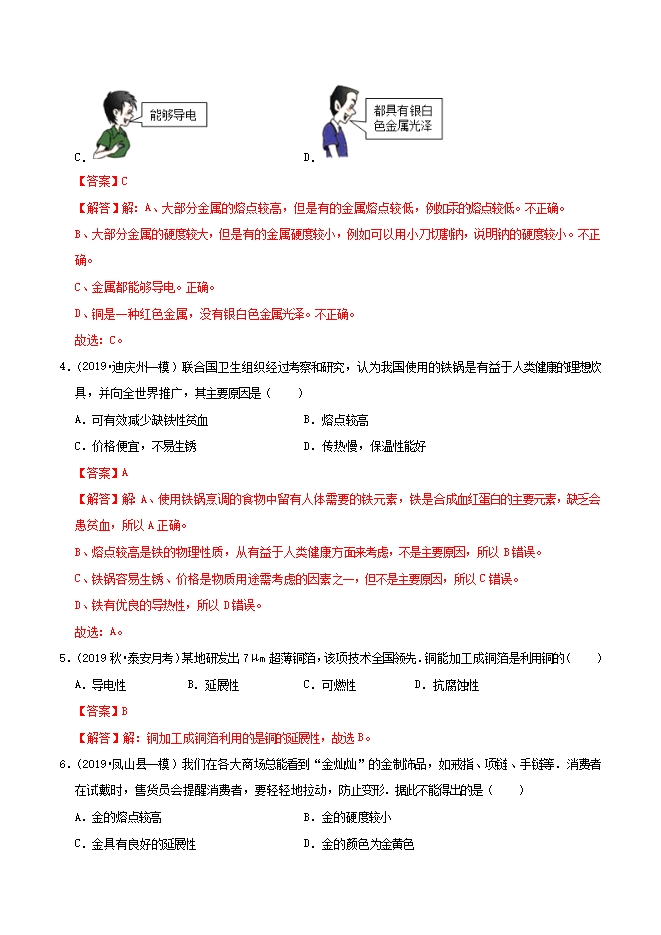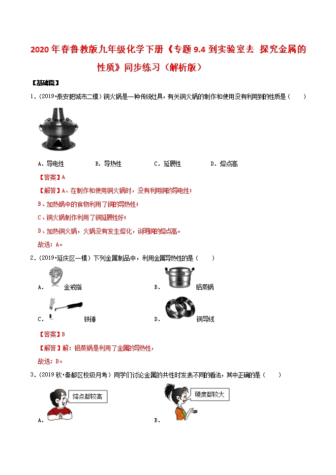 【内容简介】联合国卫生组织经过考察和研究,认为我国使用的铁锅是有益于人类健康的理想炊具,并向全世界推广,其主要原因是( )A.可有效减少缺铁性贫血B.熔点较高C.价格便宜,不易生锈D.传热慢,保温性能好【答案】A【解答】解:A、使用铁锅烹调的食物中留有人体需要的铁元素,铁是合成血红蛋白的主要元素,缺乏会患贫血,所以A正确。B、熔点较高是铁的物理性质,从有益于人类健康方面来考虑,不是主要原因,所以B错误。C、铁锅容易生锈、价格是物质用途需考虑的因素之一,但不是主要原因,所以C错误。D、铁有优良的导热性,所以D错误。故选:A。5.(2019秋•泰安月考)某地研发出7μm超薄铜箔,该项技术全国领先.铜能加工成铜箔是利用铜的( )A.导电性B.延展性C.可燃性D.抗腐蚀性【答案】B【解答】解:铜加工成铜箔利用的是铜的延展性,故选B。.....