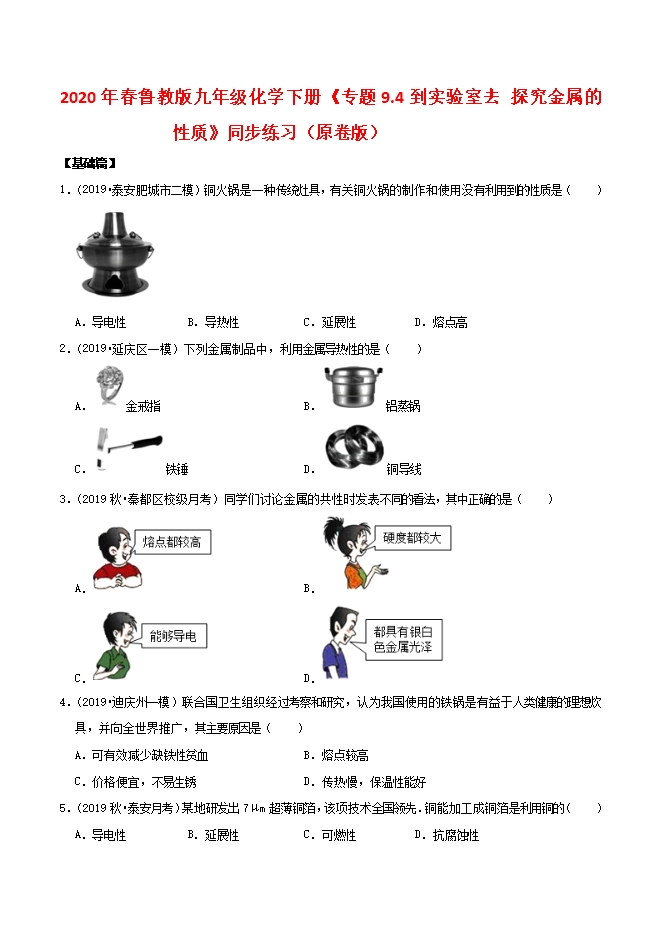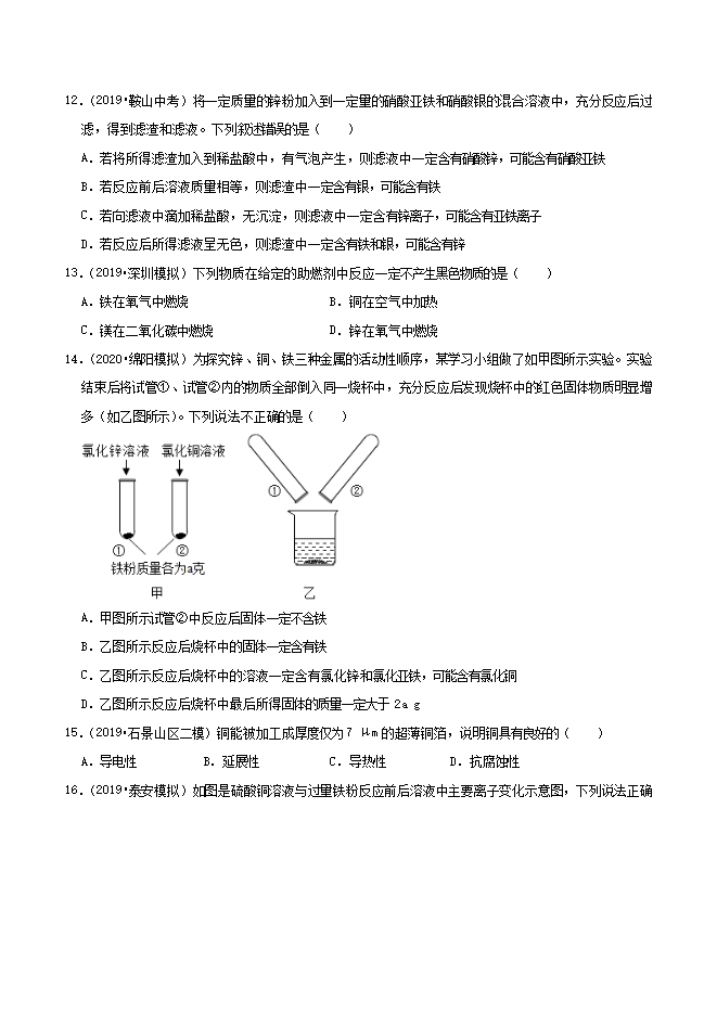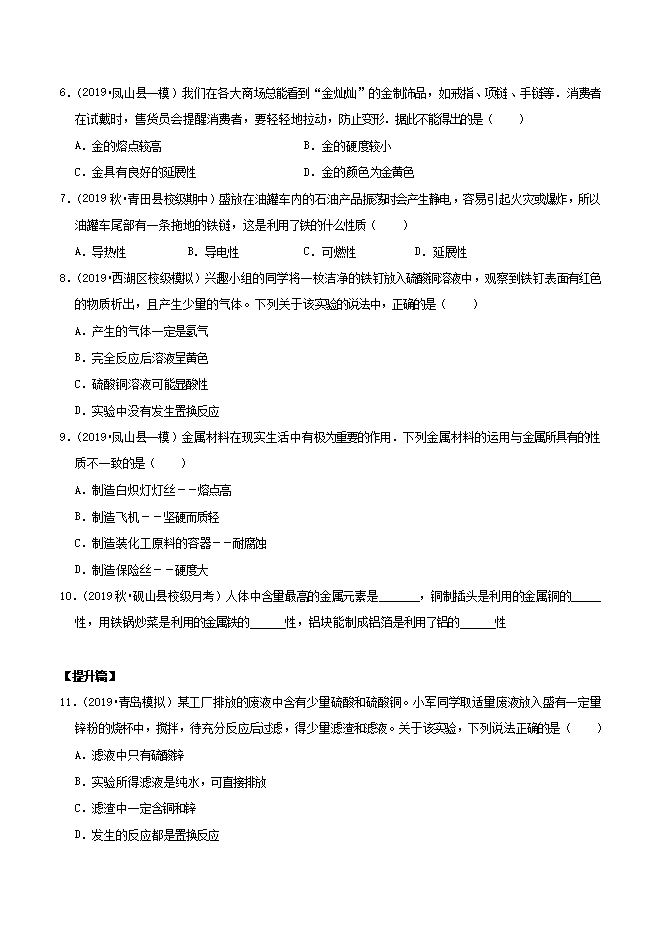【内容简介】我们在各大商场总能看到“金灿灿”的金制饰品,如戒指、项链、手链等.消费者在试戴时,售货员会提醒消费者,要轻轻地拉动,防止变形.据此不能得出的是( )A.金的熔点较高B.金的硬度较小C.金具有良好的延展性D.金的颜色为金黄色7.(2019秋•青田县校级期中)盛放在油罐车内的石油产品振荡时会产生静电,容易引起火灾或爆炸,所以油罐车尾部有一条拖地的铁链,这是利用了铁的什么性质( )A.导热性B.导电性C.可燃性D.延展性8.(2019•西湖区校级模拟)兴趣小组的同学将一枚洁净的铁钉放入硫酸铜溶液中,观察到铁钉表面有红色的物质析出,且产生少量的气体。下列关于该实验的说法中,正确的是( )A.产生的气体一定是氢气B.完全反应后溶液呈黄色C.硫酸铜溶液可能显酸性D.实验中没有发生置换反应9.(2019•凤山县一模)金属材料在现实生活中有极为重要的作用.下列金属材料的运用与金属所具有的.....