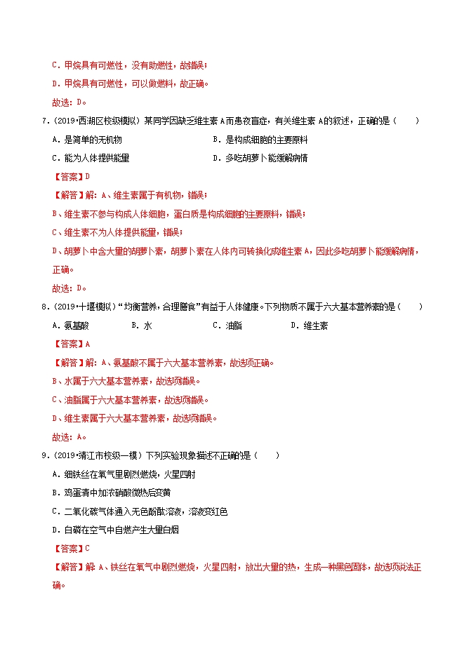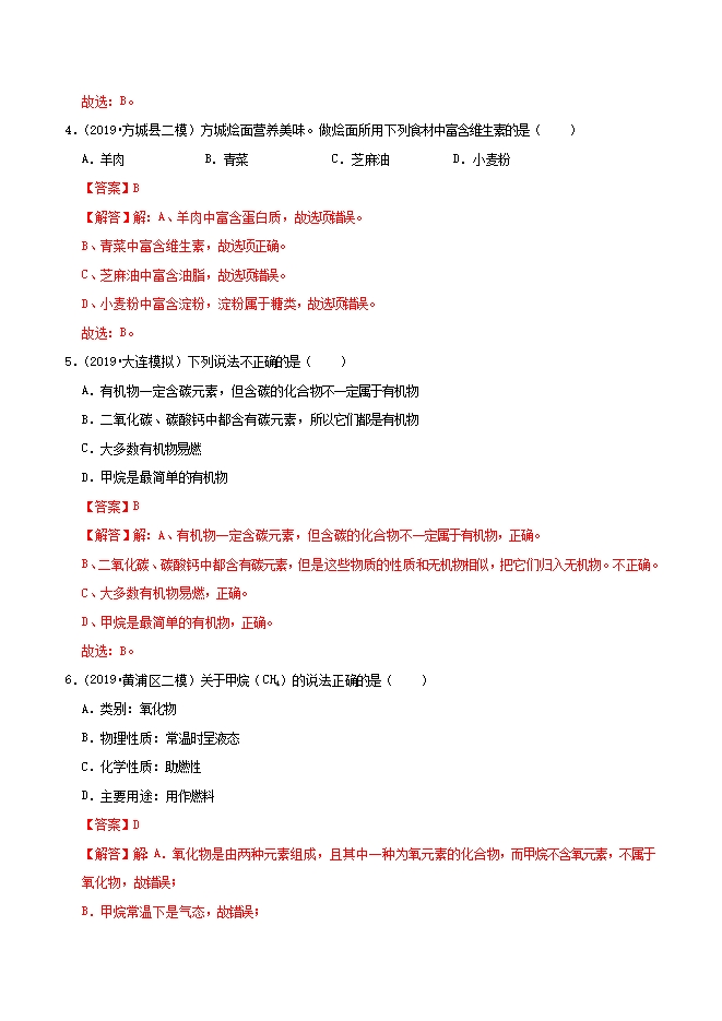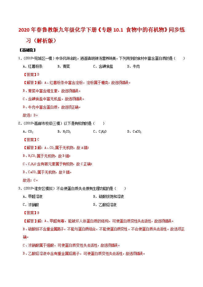【内容简介】中华风味名吃,逍遥镇胡辣汤营养味美,下列用到的食材中富含蛋白质的是( )A.红薯粉条B.青菜C.含碘食盐D.牛肉【答案】D【解答】解:A、红薯粉条中富含淀粉,淀粉属于糖类,故选项错误。B、青菜中富含维生素,故选项错误。C、含碘食盐中富无机盐,故选项错误。D、牛肉中富含蛋白质,故选项正确。故选:D。2.(2019•高邮市校级三模)以下是有机物的是( )A.CO2B.H2CO3C.C2H6OD.CaCO3【答案】C【解答】解:A、CO2属于无机物,故A错;B、H2CO3属于无机物,故B错;C、C2H6O含有碳元素属于有机物,故C正确;D、CaCO3属于无机物,故D错。故选:C。......