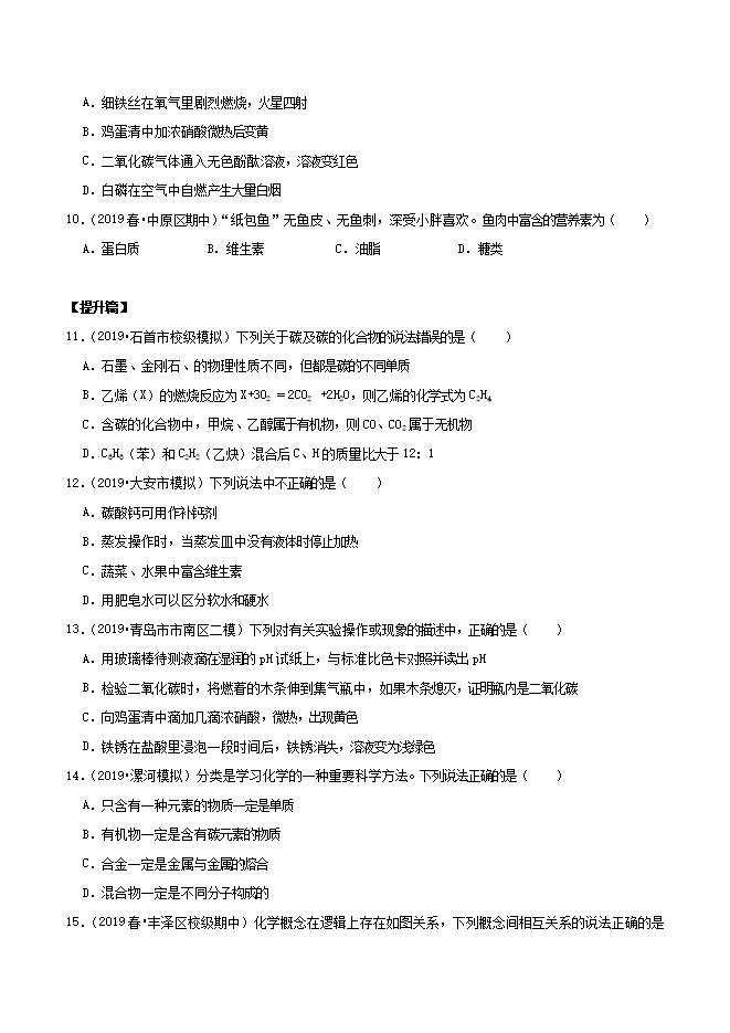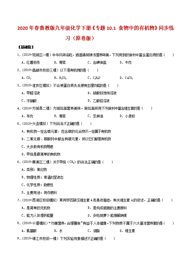 2020年春鲁教版九年级化学下册《专题10.1 食物中的有机物》同步练习(原卷版)