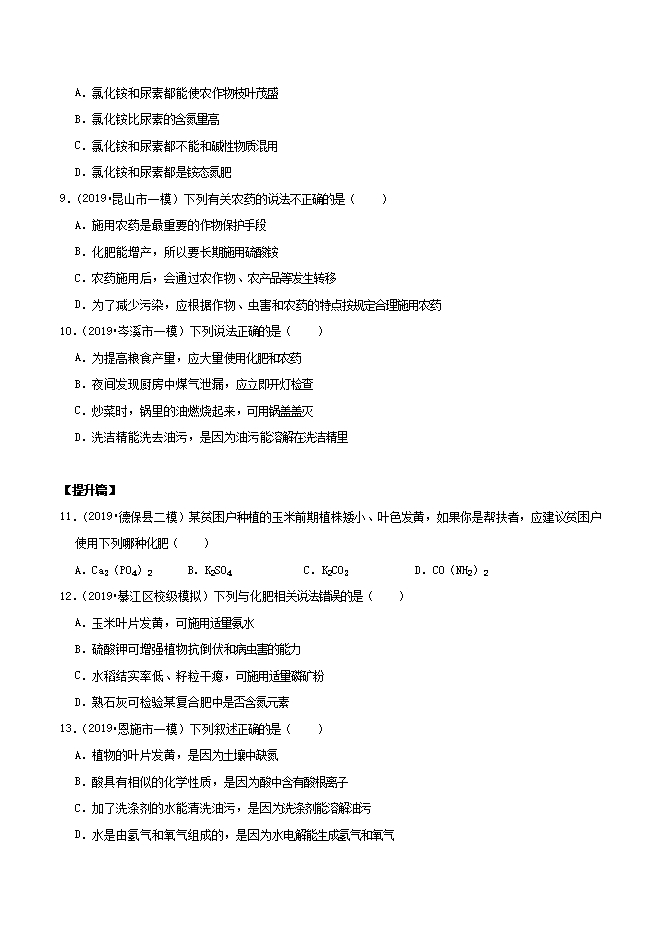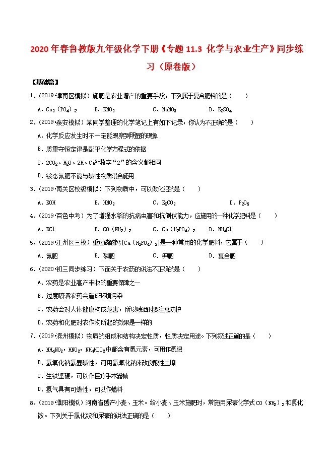 2020年春鲁教版九年级化学下册《专题11.3 化学与农业生产》同步练习(原卷版)