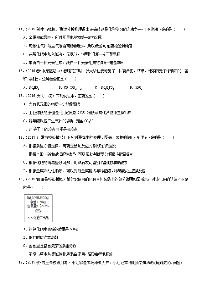 【内容简介】下列物质中,可以做化肥的是( )A.KOHB.HNO3C.K2CO3 D.P2O54.(2019•百色中考)为了增强水稻的抗病虫害和抗倒伏能力,应施用的一种化学肥料是( )A.KClB.CO(NH2)2C.Ca(H2PO4)2D.NH4Cl5.(2019•江州区三模)重过磷酸钙[Ca(H2PO4)2]是一种常用的化学肥料,它属于( )A.氮肥B.磷肥C.钾肥D.复合肥6.(2020•初三同步练习)下面关于农药的说法不正确的是( )A.农药是农业高产丰收的重要保障之一B.过度喷洒农药会造成环境污染C.农药会对人体健康构成危害,所以喷洒时要注意防护D.农药和化肥对农作物所起的效果是一样的7.(2019•滨州模拟)物质的组成和结构决定性质,性质决定用途。下列叙述正确的是( )A.NH4NO3,HNO3,NH4HCO3中都含有氮元素,可用作氮肥B.氢氧化钠氢显碱性,可用氢氧化钠来改良酸性土壤......