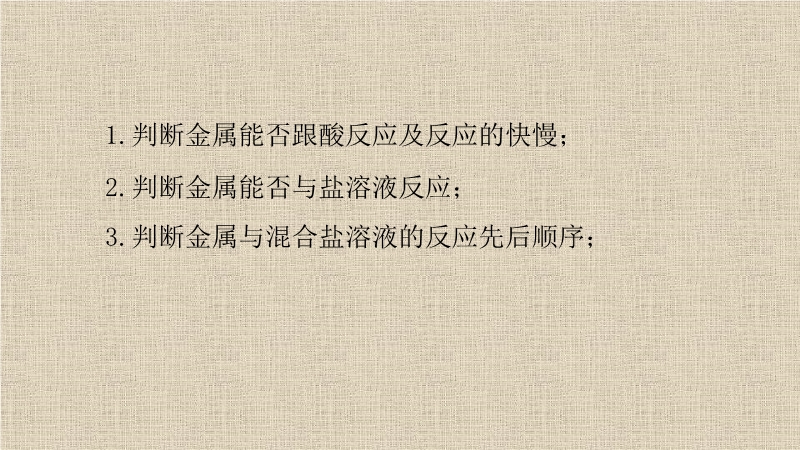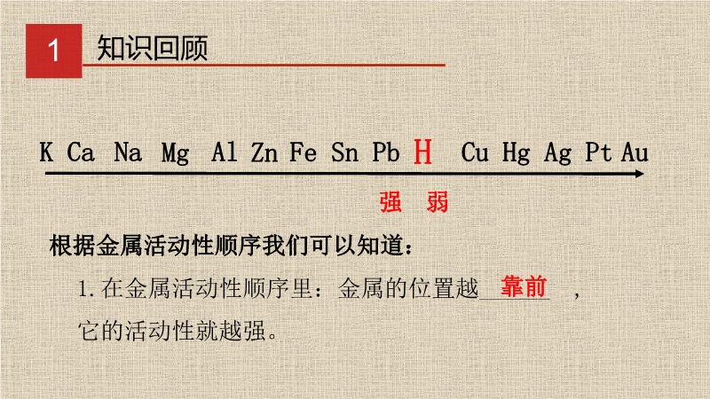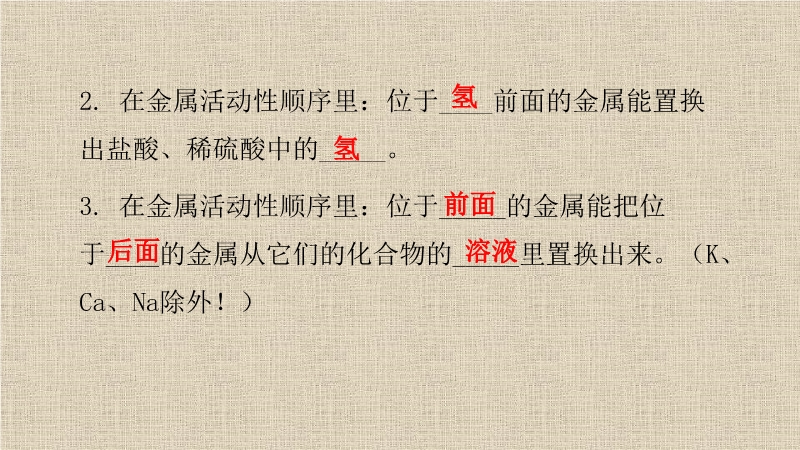 【内容简介】在金属活动性顺序里:金属的位置越______ ,它的活动性就越强。在金属活动性顺序里:位于_____的金属能把位于____的金属从它们的化合物的_____里置换出来。(K、Ca、Na除外!)判断金属能否跟酸反应及反应的快慢判断金属能否与盐溶液反应判断金属与混合盐溶液的反应先后顺序