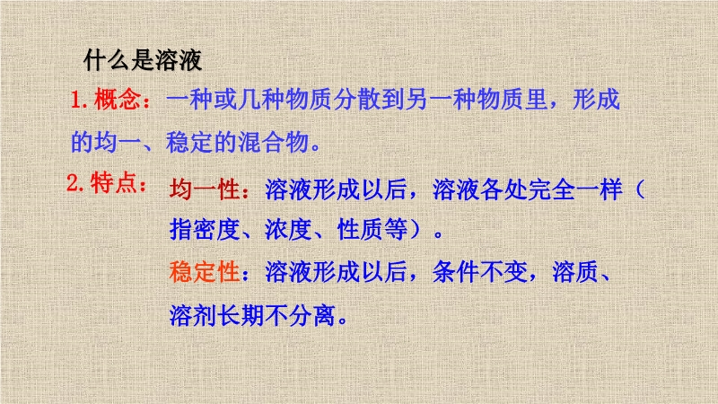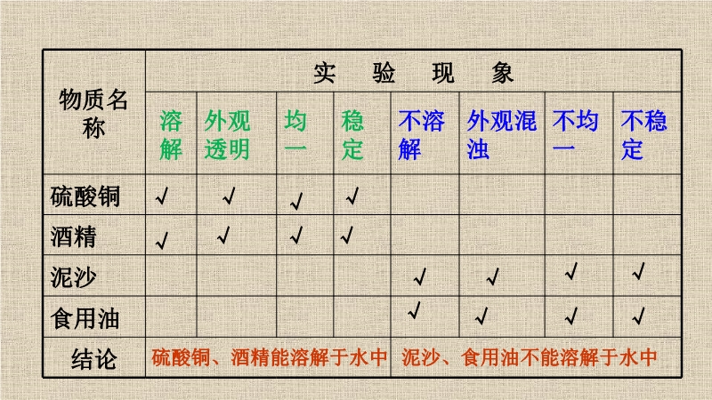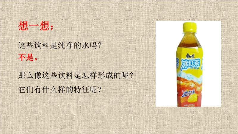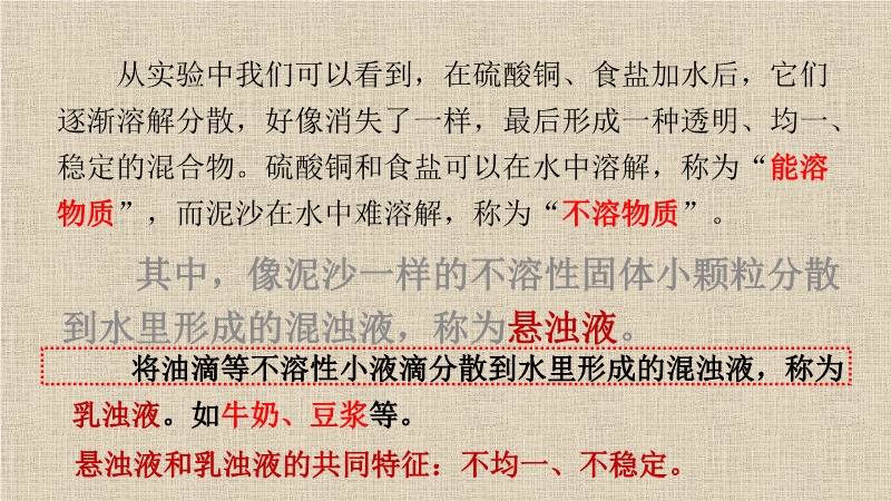 【内容简介】这些饮料是纯净的水吗?那么像这些饮料是怎样形成的呢?它们有什么样的特征呢?从实验中我们可以看到,在硫酸铜、食盐加水后,它们逐渐溶解分散,好像消失了一样,最后形成一种透明、均一、稳定的混合物。硫酸铜和食盐可以在水中溶解,称为“能溶物质”,而泥沙在水中难溶解,称为“不溶物质”其中,像泥沙一样的不溶性固体小颗粒分散到水里形成的混浊液,称为悬浊液。将油滴等不溶性小液滴分散到水里形成的混浊液,称为乳浊液。如牛奶、豆浆等悬浊液和乳浊液的共同特征:不均一、不稳定。对于任何一种溶液,溶质可以有多种,但溶剂只有一种。不是只有水可以做溶剂,汽油、酒精等均可以做溶剂,这些溶剂的溶解能力是否相同呢?......