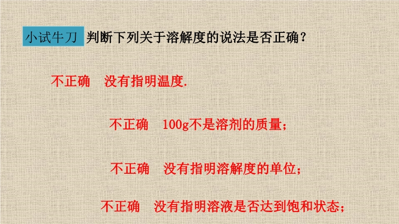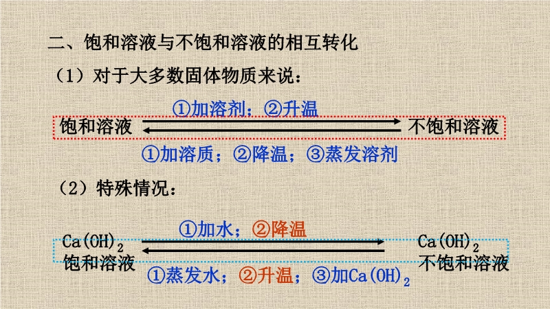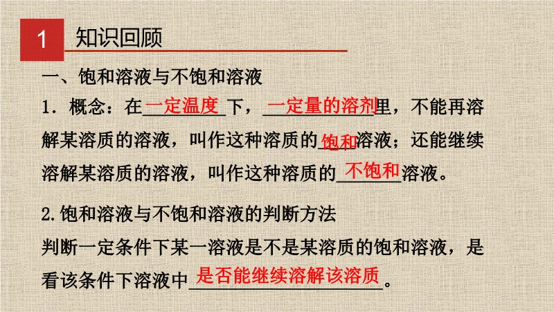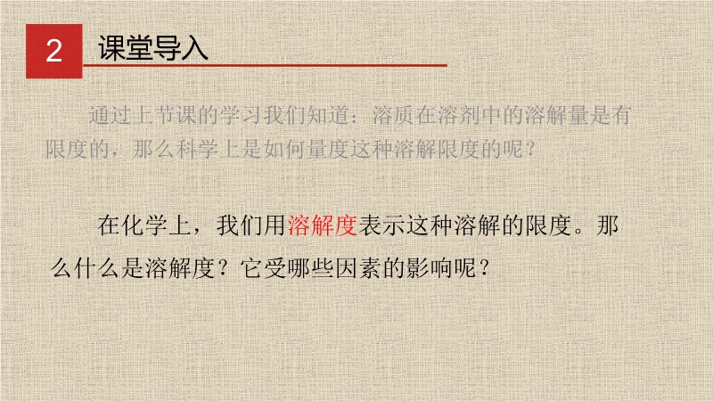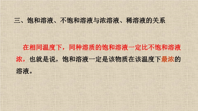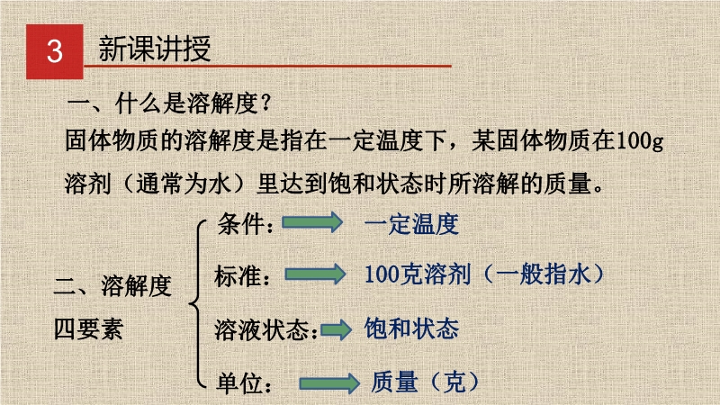 【内容简介】1.概念:在_________下,____________里,不能再溶解某溶质的溶液,叫作这种溶质的____溶液;还能继续溶解某溶质的溶液,叫作这种溶质的_______溶液。2.饱和溶液与不饱和溶液的判断方法判断一定条件下某一溶液是不是某溶质的饱和溶液,是看该条件下溶液中_____________________三、饱和溶液不饱和溶液与浓溶液、稀溶液的关系1.饱和溶液不一定是浓溶液,不饱和溶液不一定是稀溶液。2.在相同温度下,同种溶质的饱和溶液一定比不饱和溶液浓,也就是说,饱和溶液一定是该物质在该温度下最浓的溶液。通过上节课的学习我们知道溶质在溶剂中的溶解量是有限度的,那么科学上是如何量度这种溶解限度的呢?在化学上,我们用溶解度表示这种溶解的限度。那么什么是溶解度?它受哪些因素的影响呢