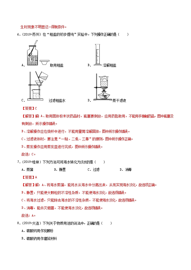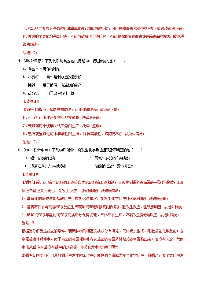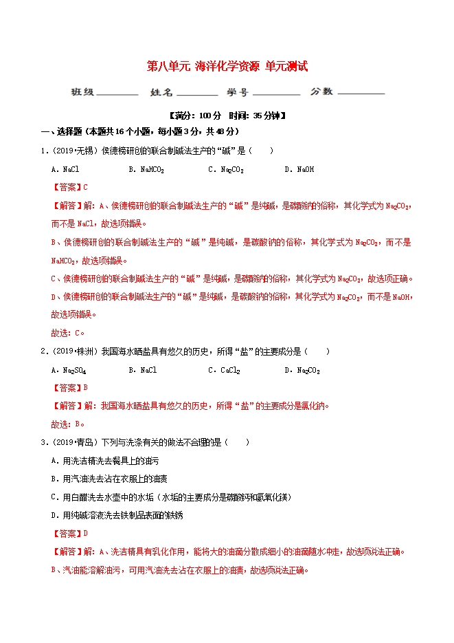【内容简介】侯德榜研创的联合制碱法生产的“碱”是( )A.NaClB.NaHCO3C.Na2CO3D.NaOH【答案】C【解答】解:A、侯德榜研创的联合制碱法生产的“碱”是纯碱,是碳酸钠的俗称,其化学式为Na2CO3,而不是NaCl,故选项错误。B、侯德榜研创的联合制碱法生产的“碱”是纯碱,是碳酸钠的俗称,其化学式为Na2CO3,而不是NaHCO3,故选项错误。C、侯德榜研创的联合制碱法生产的“碱”是纯碱,是碳酸钠的俗称,其化学式为Na2CO3,故选项正确。D、侯德榜研创的联合制碱法生产的“碱”是纯碱,是碳酸钠的俗称,其化学式为Na2CO3,而不是NaOH,故选项错误。故选:C。2.(2019•株洲)我国海水晒盐具有悠久的历史,所得“盐”的主要成分是( )A.Na2SO4B.NaClC.CaCl2D.Na2CO3【答案】B【解答】解:我国海水晒盐具有悠久的历史,所得“盐”的主要成分是氯化钠。故选:B。3.(2019•青岛)下列与洗涤有关的做法不合理的是( )A.用洗洁精洗去餐具上的油污......