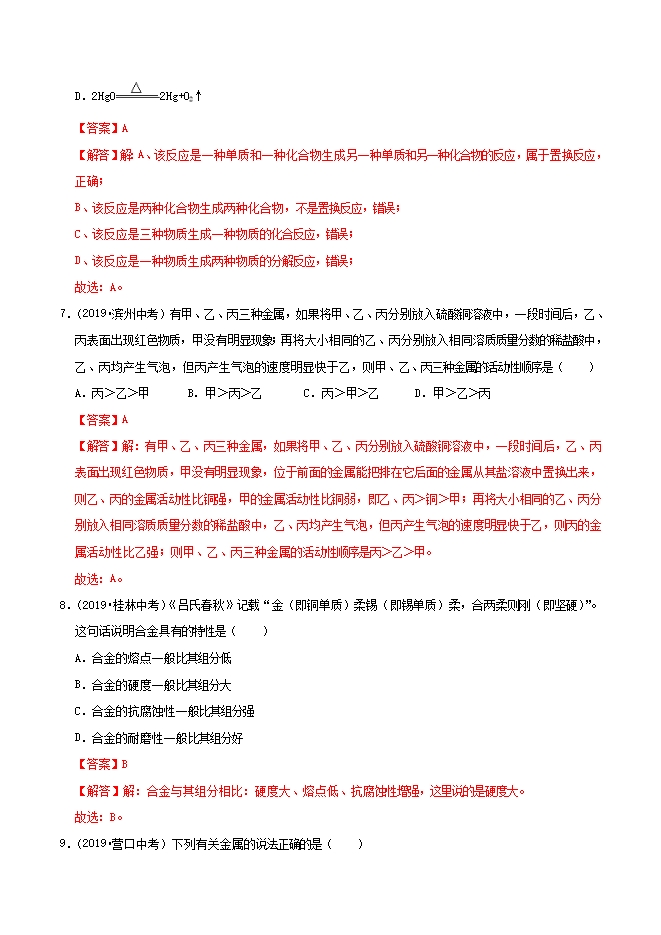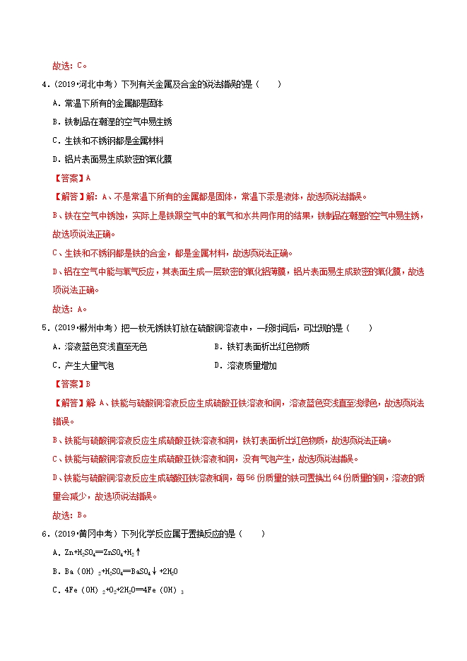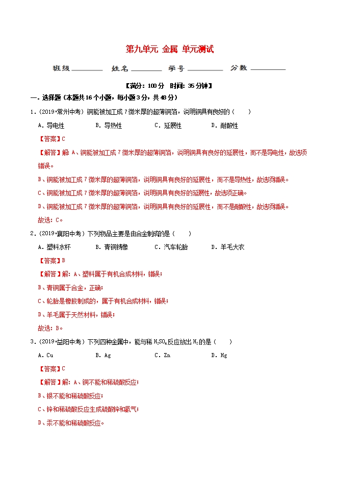 【内容简介】铜能被加工成7微米厚的超薄铜箔,说明铜具有良好的( )A.导电性B.导热性C.延展性D.耐酸性【答案】C【解答】解:A、铜能被加工成7微米厚的超薄铜箔,说明铜具有良好的延展性,而不是导电性,故选项错误。B、铜能被加工成7微米厚的超薄铜箔,说明铜具有良好的延展性,而不是导热性,故选项错误。C、铜能被加工成7微米厚的超薄铜箔,说明铜具有良好的延展性,故选项正确。D、铜能被加工成7微米厚的超薄铜箔,说明铜具有良好的延展性,而不是耐酸性,故选项错误。故选:C。2.(2019•襄阳中考)下列物品主要是由合金制成的是( )A.塑料水杯B.青铜铸像C.汽车轮胎D.羊毛大衣【答案】B【解答】解:A、塑料属于有机合成材料,错误;B、青铜属于合金,正确;C、轮胎是橡胶制成的,属于有机合成材料,错误;D、羊毛属于天然材料,错误;故选:B。......
