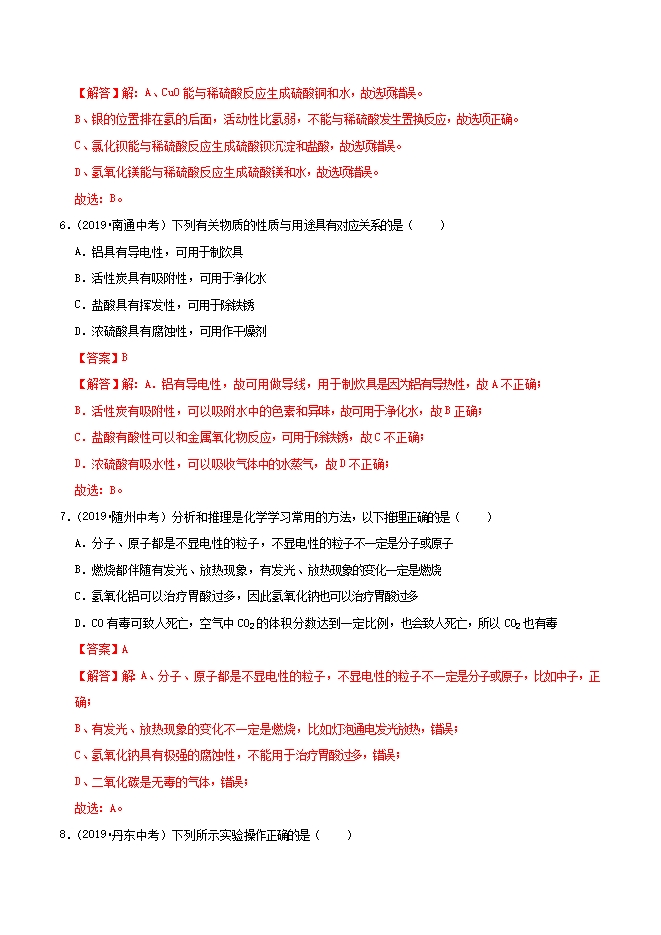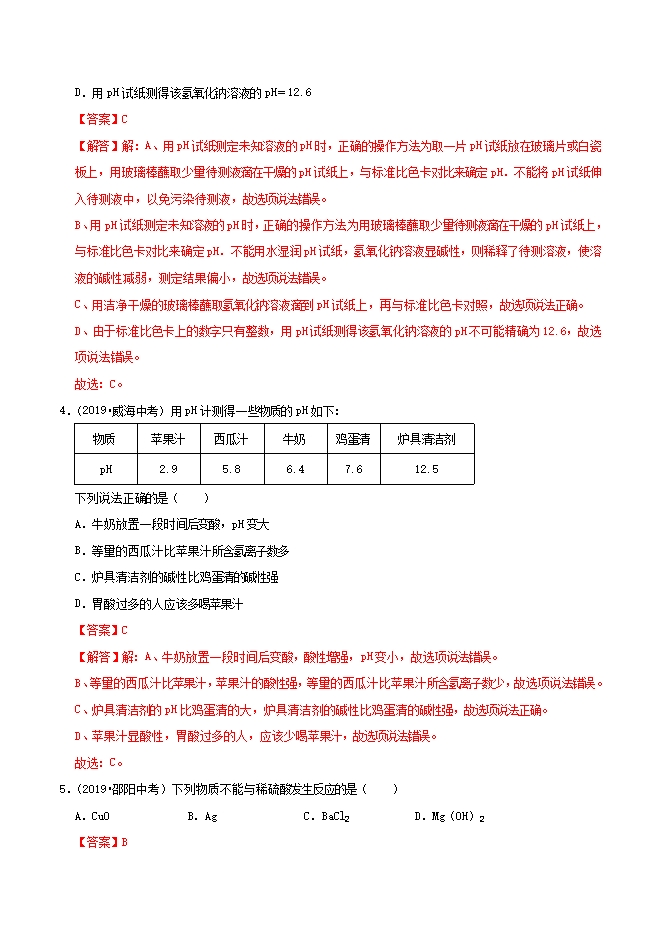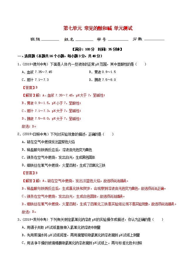 【内容简介】下面是人体内一些液体的正常pH范围,其中显酸性的是( )A.血浆7.35~7.45B.胃液0.9~1.5C.胆汁7.1~7.3D.胰液7.5~8.0【答案】B【解答】解:A、血浆7.35~7.45,pH大于7,呈碱性;B、胃液0.9~1.5,pH小于7,呈酸性;C、胆汁7.1~7.3,pH大于7,呈碱性;D、胰液7.5~8.0,pH大于7,呈碱性;故选:B。2.(2019•日照中考)下列对实验现象的描述,正确的是( )A.硫在空气中燃烧发出蓝紫色火焰B.稀盐酸与铁锈反应后,溶液由无色变为黄色C.镁条在空气中燃烧,发出白光,生成黑色固体D.细铁丝在氧气中燃烧,火星四射,生成了四氧化三铁【答案】B【解答】解:A、硫在空气中燃烧,发出淡蓝色火焰,故选项说法错误。B、稀盐酸与铁锈反应后,生成氯化铁和贺岁,会观察到溶液由无色变为黄色,故选项说法正确。C、镁条在空气中燃烧,发出白光,生成白色固体,故选项说法错误。D、细铁丝在氧气中燃烧,火星四射,生成了四氧化三铁是实验结论而不是实验现象,故选项说法错误。故选:B。......