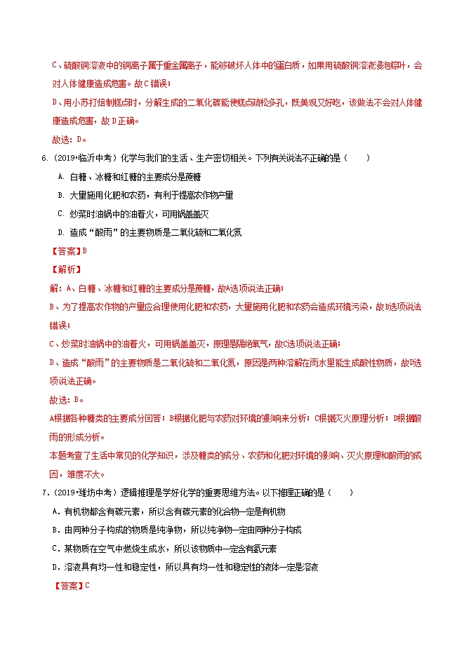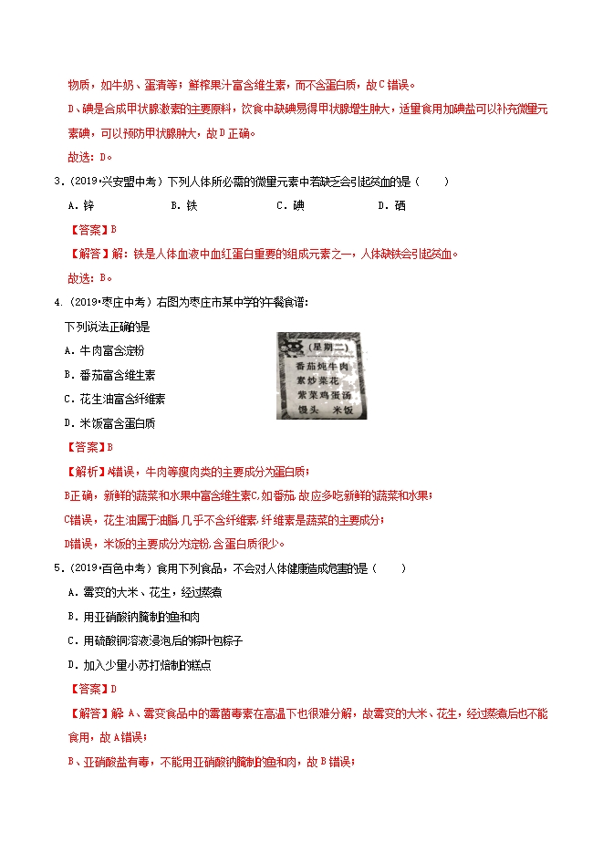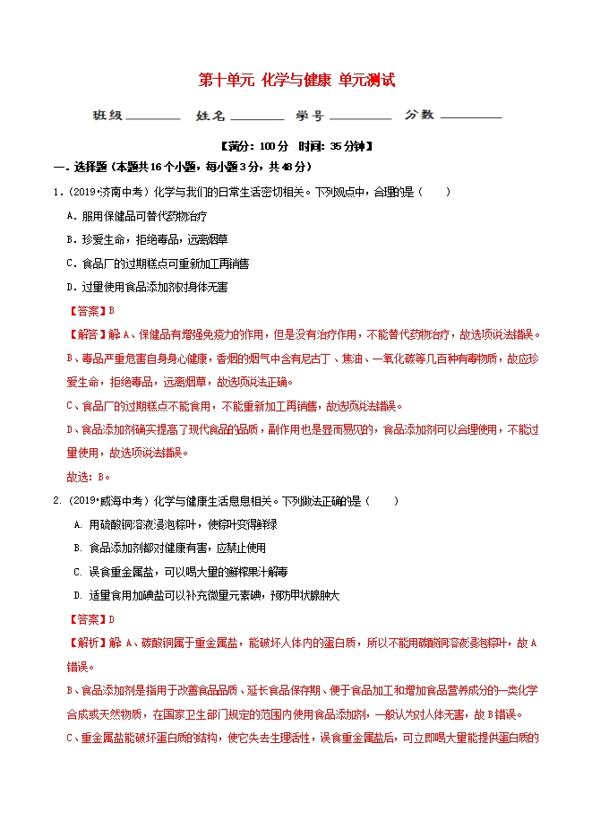 【内容简介】化学与我们的日常生活密切相关。下列观点中,合理的是( )A.服用保健品可替代药物治疗B.珍爱生命,拒绝毒品,远离烟草C.食品厂的过期糕点可重新加工再销售D.过量使用食品添加剂对身体无害【答案】B【解答】解:A、保健品有增强免疫力的作用,但是没有治疗作用,不能替代药物治疗,故选项说法错误。B、毒品严重危害自身身心健康,香烟的烟气中含有尼古丁、焦油、一氧化碳等几百种有毒物质,故应珍爱生命,拒绝毒品,远离烟草,故选项说法正确。C、食品厂的过期糕点不能食用,不能重新加工再销售,故选项说法错误。D、食品添加剂确实提高了现代食品的品质,副作用也是显而易见的,食品添加剂可以合理使用,不能过量使用,故选项说法错误。故选:B。2.(2019•威海中考)化学与健康生活息息相关。下列做法正确的是( )A. 用硫酸铜溶液浸泡粽叶,使粽叶变得鲜绿B. 食品添加剂都对健康有害,应禁止使用C. 误食重金属盐,可以喝大量的鮮榨果汁解毒D. 适量食用加碘盐可以补充微量元素碘,预防甲状腺肿大【答案】D【解析】解:A、碳酸铜属于重金属盐,能破坏人体内的蛋白质,所以不能用碳酸铜溶液浸泡粽叶,故A错误。 B、食品添加剂是指用于改善食品品质、延长食品保存期、便于食品加工和增加食品营养成分的一类化学合成或天然物质,在国家卫生部门规定的范围内使用食品添加剂,一般认为对人体无害,故B错误。......