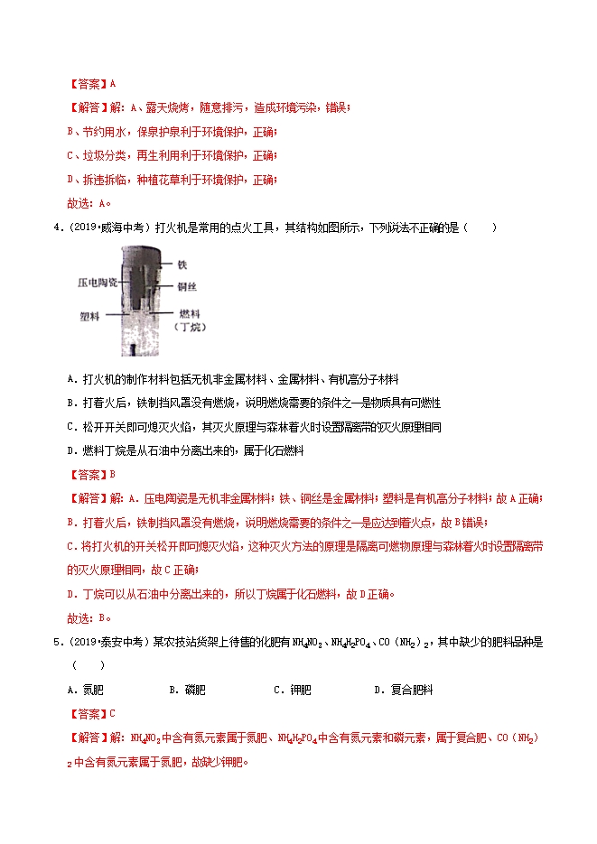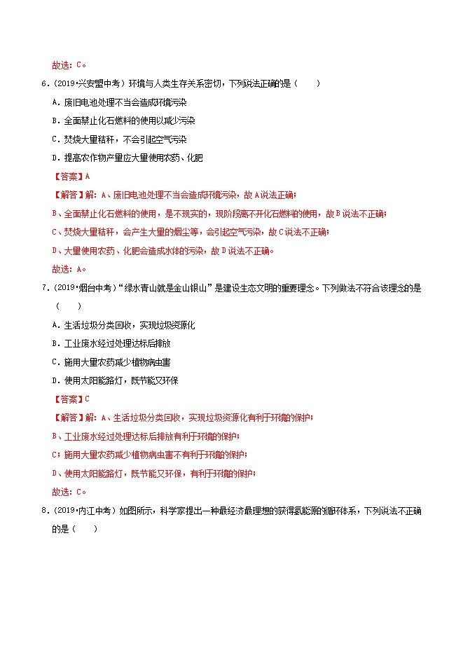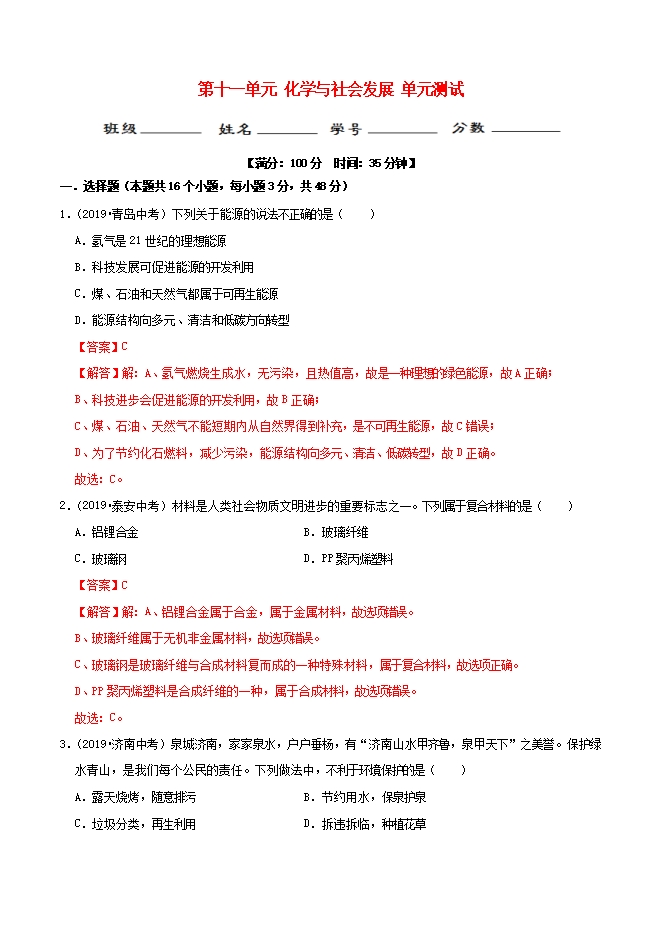 【内容简介】下列关于能源的说法不正确的是( )A.氢气是21世纪的理想能源B.科技发展可促进能源的开发利用C.煤、石油和天然气都属于可再生能源D.能源结构向多元、清洁和低碳方向转型【答案】C【解答】解:A、氢气燃烧生成水,无污染,且热值高,故是一种理想的绿色能源,故A正确;B、科技进步会促进能源的开发利用,故B正确;C、煤、石油、天然气不能短期内从自然界得到补充,是不可再生能源,故C错误;D、为了节约化石燃料,减少污染,能源结构向多元、清洁、低碳转型,故D正确。故选:C。2.(2019•泰安中考)材料是人类社会物质文明进步的重要标志之一。下列属于复合材料的是( )A.铝锂合金B.玻璃纤维C.玻璃钢D.PP聚丙烯塑料【答案】C【解答】解:A、铝锂合金属于合金,属于金属材料,故选项错误。B、玻璃纤维属于无机非金属材料,故选项错误。C、玻璃钢是玻璃纤维与合成材料复而成的一种特殊材料,属于复合材料,故选项正确。D、PP聚丙烯塑料是合成纤维的一种,属于合成材料,故选项错误。故选:C。......