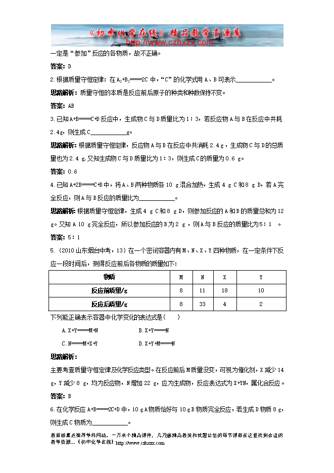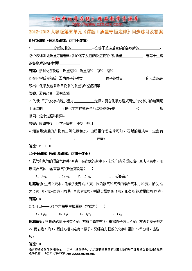 2012-2013人教版第五单元《课题1质量守恒定律》同步练习及答案