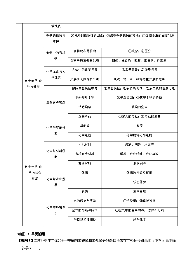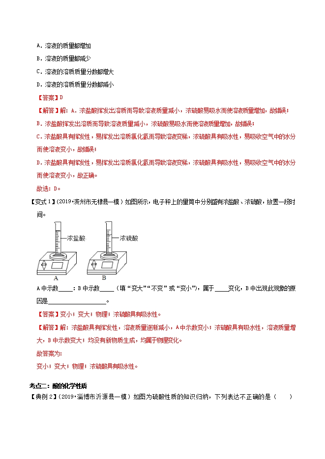 【内容简介】考点一:常见的酸【典例1】(2019•枣庄二模)将一定量的浓硫酸和浓盐酸分别敞口放置在空气中一段时间后,下列说法正确的是( )A.溶液的质量都增加B.溶液的质量都减少C.溶液的溶质质量分数都增大D.溶液的溶质质量分数都减小【答案】D【解答】解:A.浓盐酸挥发出溶质而导致溶液质量减小,浓硫酸易吸水而使溶液质量增加,故错误;B.浓盐酸挥发出溶质而导致溶液质量减小,浓硫酸易吸水而使溶液质量增加,故错误;C.浓盐酸具有挥发性,易挥发出溶质氯化氢而导致溶液变稀,浓硫酸具有吸水性,易吸收空气中的水分而使溶液变小,故错误;D.浓盐酸具有挥发性,易挥发出溶质氯化氢而导致溶液变稀,浓硫酸具有吸水性,易吸收空气中的水分而使溶液变小,故正确。故选:D。【变式1】(2019•滨州市无棣县一模)如图所示,电子秤上的量筒中分别盛有浓盐酸、浓硫酸,放置一段......