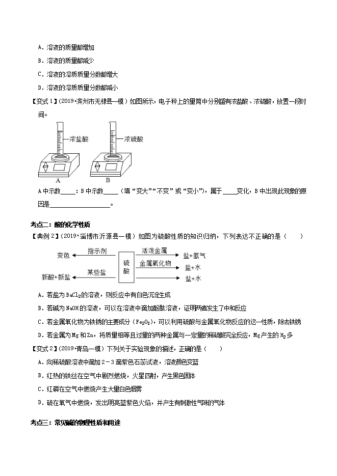 【内容简介】酸的化学性质【典例2】(2019•淄博市沂源县一模)如图为硫酸性质的知识归纳,下列表达不正确的是( ) A.若盐为BaCl2的溶液,则反应中有白色沉淀生成B.若碱为NaOH的溶液,可以在溶液中滴加酚酞溶液,证明两者发生了中和反应C.若金属氧化物为铁锈的主要成分(Fe2O3),可以利用硫酸与金属氧化物反应的这一性质,除去铁锈D.若金属为Mg和Zn,将质量相等且过量的两种金属与一定量的稀硫酸完全反应,Mg产生的H2多【变式2】(2019•青岛一模)下列关于实验现象的描述,正确的是( )A.向稀硫酸溶液中滴加2﹣3滴紫色石蕊试液,溶液颜色变蓝B.红热的铁丝在空气中剧烈燃烧,火星四射,产生黑色固体C.红磷在空气中燃烧产生大量白色烟雾D.硫在氧气中燃烧,发出明亮蓝紫色火焰,并产生有刺激性气味的气体考点三:常见碱的物理性质和用途【典例3】(2019•泗县一模)下列有关物质用途的说法中,错误的是( )A.用氢氧化钠改良酸性土壤B.二氧化锰作过氧化氢制取氧气的催化剂C.氢氧化铝用于治疗胃酸过多D.用稀盐酸除去金属表面的锈时间。......