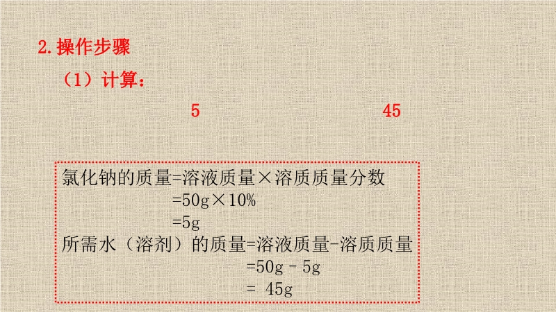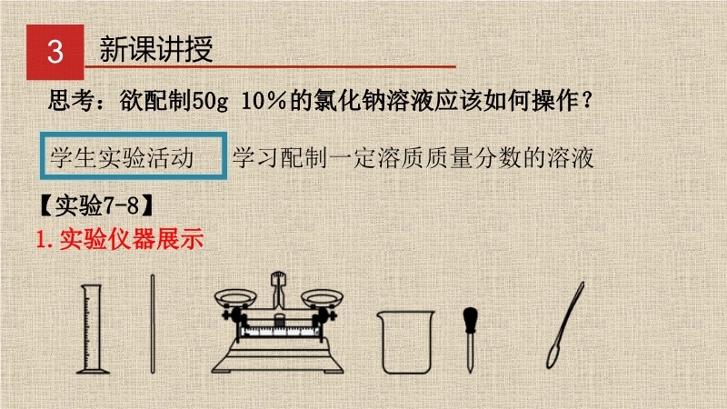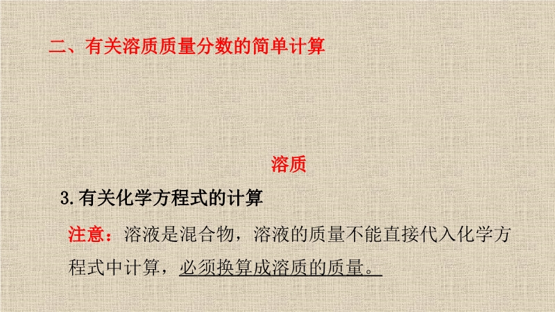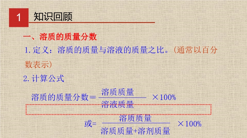 【内容简介】1.溶质的质量分数定义:溶质的质量与溶液的质量之比。(通常以百分数表示) 二、有关溶质质量分数的简单计算1.配制一定量的某一组成的溶液,求所需溶质和溶剂的量2.有关溶液稀释的计算计算依据:稀释前后溶质的质量不变注意:溶液是混合物,溶液的质量不能直接代入化学方程式中计算,必须换算成溶质的质量托盘天平的操作要点:①用天平称量时应“左物右码”;②称量固体化学品时,两托盘应放上质量相等的称量纸,调节天平零点准备进行称量;③先将砝码和游码调整到所需氯化钠质量的刻度,然后逐渐添加氯化钠直到天平平衡;④称量完毕,砝码和游码还归原位。倾倒的操作要点:量筒口紧贴倾斜的玻璃棒的中上部,让水沿着玻璃棒缓缓流入烧杯,切勿洒出②从用托盘天平称量的角度思考:a.天平未调零;b.砝码破损;c.天平读数有问题;d.药品和砝码放颠倒了;e.左盘放纸片,右盘没放纸片等。(1)所配溶液溶质质量分数偏小①从计算错误角度思考:a.水算多了;b.溶质算少了③从用量筒量取液体角度思考:量取时,仰视读量筒刻度。④从转移药品角度思考:a.烧杯不干燥或烧杯有水;b.量筒中的液体溶质未全部倒出;c.向烧杯转移固体溶质时,有一部分溶质撒落烧杯外。......