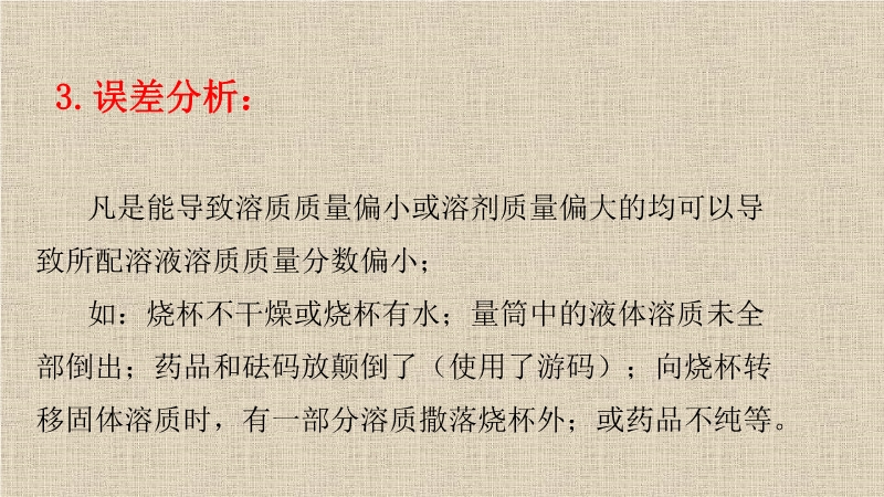 【内容简介】(1)所配溶液溶质质量分数偏小凡是能导致溶质质量偏小或溶剂质量偏大的均可以导致所配溶液溶质质量分数偏小;如:烧杯不干燥或烧杯有水;量筒中的液体溶质未全部倒出;药品和砝码放颠倒了(使用了游码);向烧杯转移固体溶质时,有一部分溶质撒落烧杯外;或药品不纯等(2)所配溶液溶质质量分数偏大凡是能导致溶质质量偏大或溶剂质量偏小的均可以导致所配溶液溶质质量分数偏小;如①称量时,所用砝码已生锈或沾有油污;②量取溶剂时,俯视读量筒刻度实验操作:在1支试管中注入10ML蒸馏水,加热至沸腾,加入研碎的明矾晶体,直到固体不再溶解,然后将上层饱和溶液倒进另一支试管中,把试管放到盛冷水的烧杯中冷却,观察。 这是由于明矾的溶解度大小随温度升降变化很明显。当在较高温度时形成的饱和溶液因降温超过其溶解量的限度,就会析出一定形状的固体,这就是冷却结晶法。思考:我们知道氯化钠的溶解度随温度变化不大,那么氯化钠能用该方法结晶吗?要使氯化钠溶液结晶,就不宜采用饱和溶液冷却结晶法,而适宜用蒸发水分的办法,这种方法称为蒸发溶剂结晶法......