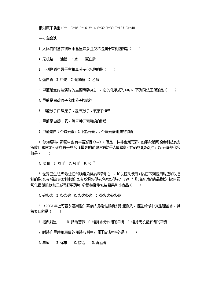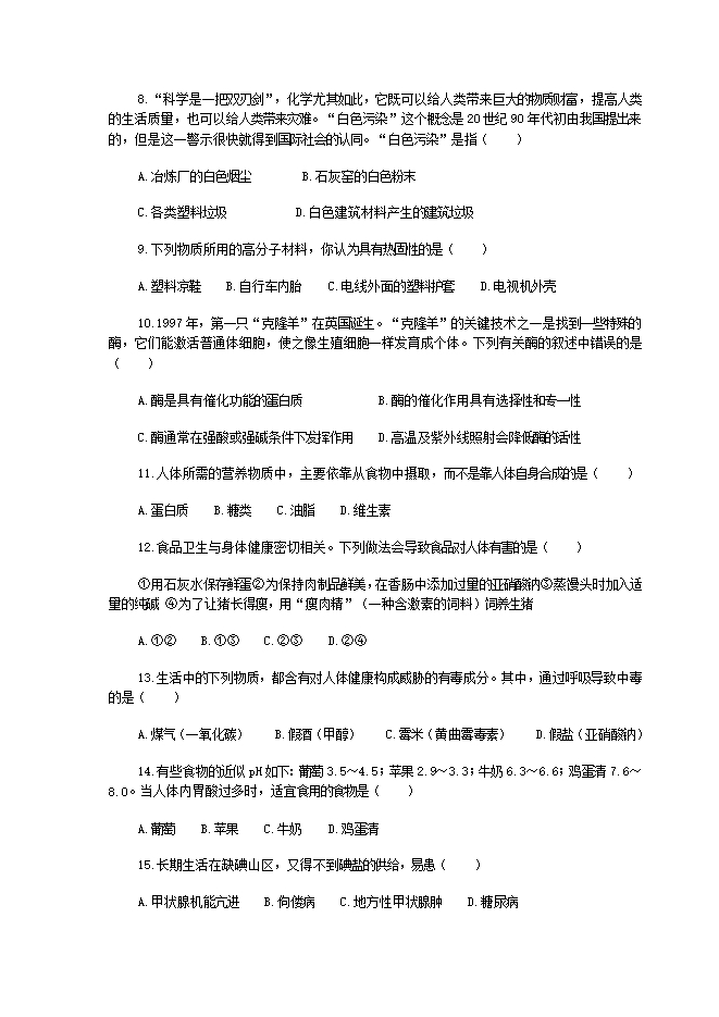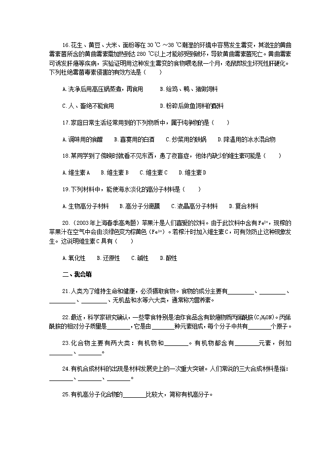 - 下一份试卷:人教版九年级《 第十二单元 化学与生活》单元测试卷2