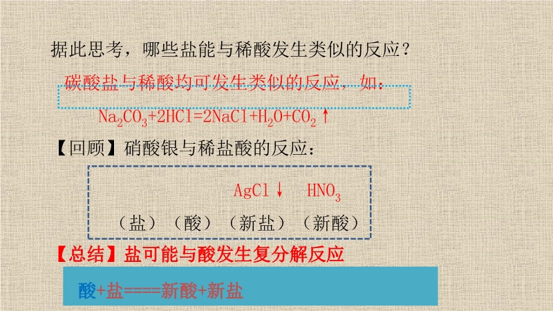 【内容简介】1.组成:由__________离子和____离子组成的________。2.分类(1)根据阳离子不同,可分为___盐、___盐、___盐等。(2)根据阴离子不同,盐可分为___ 盐、___盐、____盐等。通过前面的学习我们知道,盐能与活泼金属发生置换反应,除此之外,盐还能与哪些物质反应呢?我们一起来回顾一下。【实验8-15】取一支试管加入少许硝酸钡溶液,再滴入几滴稀硫酸,观察现象实验现象:有白色沉淀生成【实验8-16】在上述有硫酸钡沉淀的试管中,滴加几滴稀硝酸,观察到的现象是________________生成物中有沉淀或有气体或有水生成时,复分解反应才可以发生,否则就不能发生思考:复分解反应为什么能发生呢?我们从微观角度来认识一下复分解反应的实质盐的溶解性规律1、钾、钠、铵、硝酸盐都可溶。2、盐酸盐只有氯化银不溶。3、硫酸盐只有硫酸钡不溶。4、碳酸盐只溶钾、钠、铵,碳酸镁微溶,剩下都不溶。酸与碱的的溶解性规律1、酸都溶2、可溶性溶碱有五位:钾、钠、铵、钙、钡......