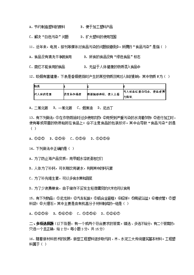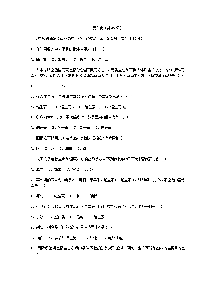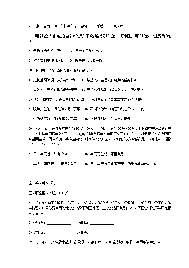 人教版九年级《 第十二单元 化学与生活》单元测试卷2