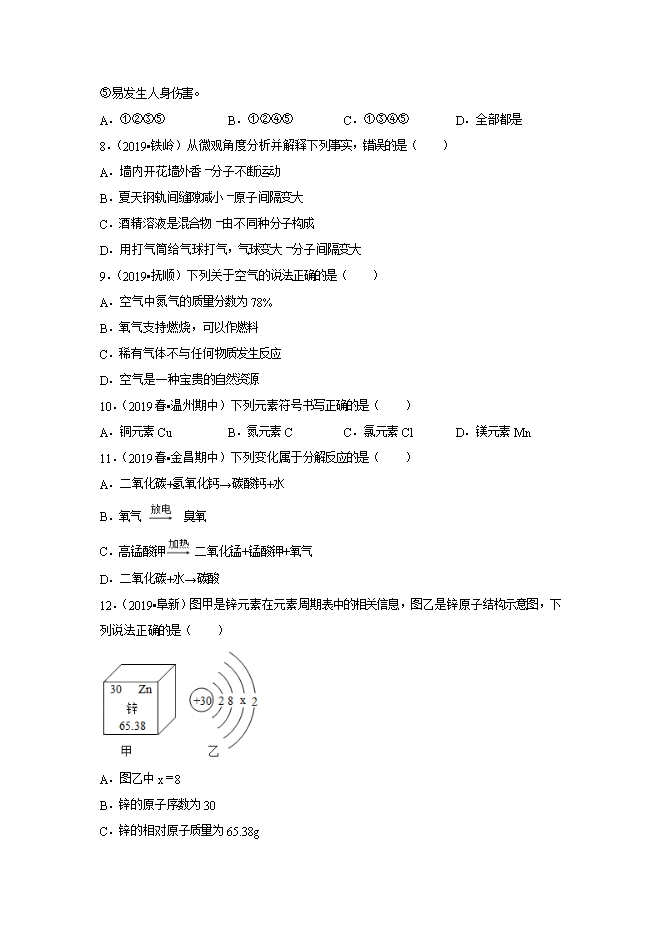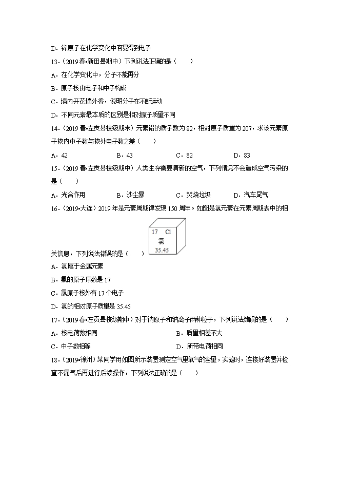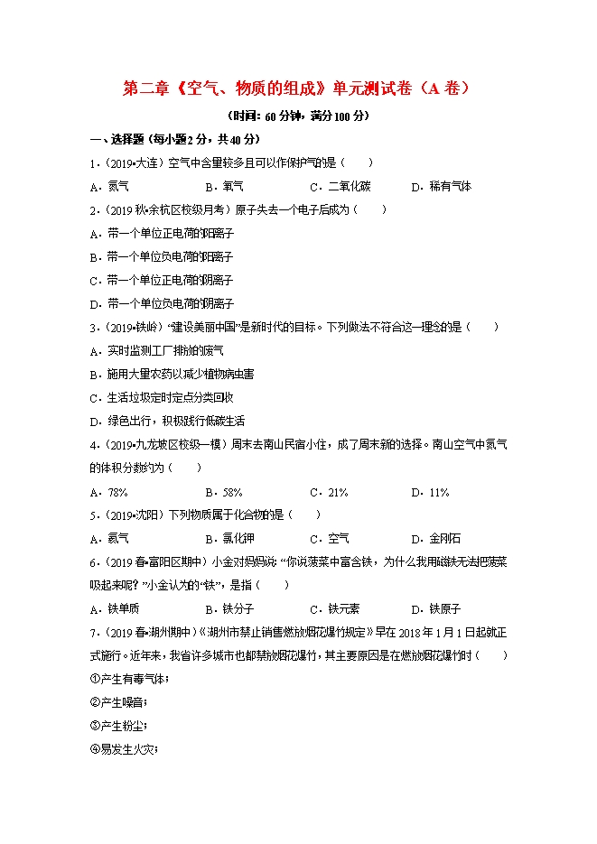【内容简介】空气中含量较多且可以作保护气的是( )A.氮气B.氧气C.二氧化碳D.稀有气体2.(2019秋•余杭区校级月考)原子失去一个电子后成为( )A.带一个单位正电荷的阳离子B.带一个单位负电荷的阳离子C.带一个单位正电荷的阴离子D.带一个单位负电荷的阴离子3.(2019•铁岭)“建设美丽中国”是新时代的目标。下列做法不符合这一理念的是( )A.实时监测工厂排放的废气B.施用大量农药以减少植物病虫害C.生活垃圾定时定点分类回收D.绿色出行,积极践行低碳生活4.(2019•九龙坡区校级一模)周末去南山民宿小住,成了周末新的选择。南山空气中氮气的体积分数约为( )A.78%B.58%C.21%D.11%5.(2019•沈阳)下列物质属于化合物的是( )A.氦气B.氯化钾C.空气D.金刚石6.(2019春•富阳区期中)小金对妈妈说:“你说菠菜中富含铁,为什么我用磁铁无法把菠菜吸起来呢?”小金认为的“铁”,是指( )A.铁单质B.铁分子C.铁元素D.铁原子7.(2019春•湖州期中)《湖州市禁止销售燃放烟花爆竹规定》早在2018年1月1日起就正式施行。近年来,我省许多城市也都禁放烟花爆竹,其主要原因是在燃放烟花爆竹时( )①产生有毒气体;②产生噪音;③产生粉尘;④易发生火灾;......