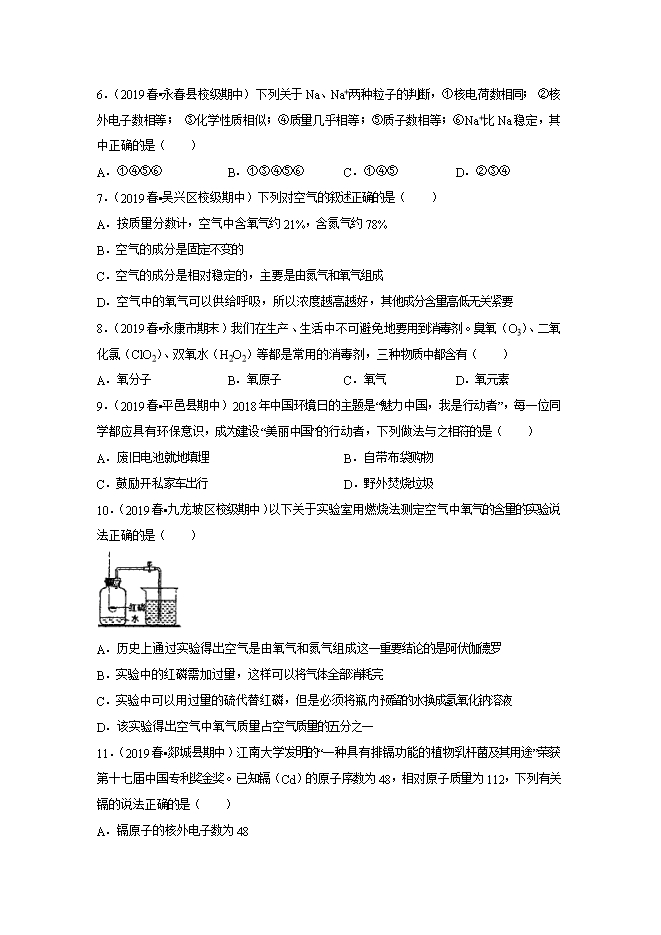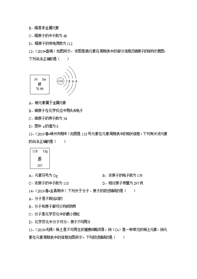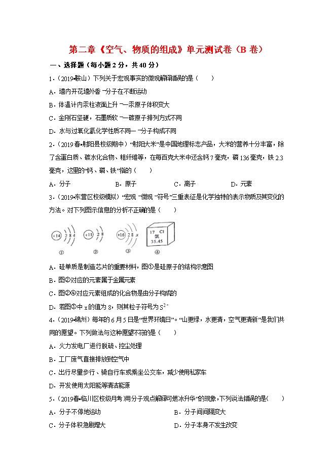 【内容简介】下列关于宏观事实的微观解释错误的是( )A.墙内开花墙外香﹣分子在不断运动B.体温计内汞柱液面上升﹣一汞原子体积变大C.金刚石坚硬,石墨质软﹣一碳原子排列方式不同D.水与过氧化氢化学性质不同一﹣分子构成不同2.(2019春•射阳县校级期中)“射阳大米”是中国地理标志产品,大米的营养十分丰富,除了含蛋白质、碳水化合物、粗纤维等,在每百克大米中还含钙7毫克,磷136毫克,铁2.3毫克,这里的“钙、磷、铁”指的( )A.分子B.原子C.离子D.元素3.(2019•东营区校级模拟)“宏观﹣微观﹣符号”三重表征是化学独特的表示物质及其变化的方法。对下列图示信息的分析不正确的是( ) A.硅单质是制造芯片的重要材料,图①是硅原子的结构示意图B.图②对应的元素属于金属元素C.图②④对应元素组成的化合物是由分子构成的D.若图③中x的值为8,则其粒子符号为S2﹣4.(2019•锦州)每年的6月5日是“世界环境日”。“山更绿,水更清,空气更清新”是我们共同的愿望。下列做法与这种愿望不符的是( )A.火力发电厂进行脱硫、控尘处理B.工厂废气直接排放到空气中C.出行尽量步行、骑自行车或乘坐公交车,减少使用私家车D.开发使用太阳能等清洁能源......