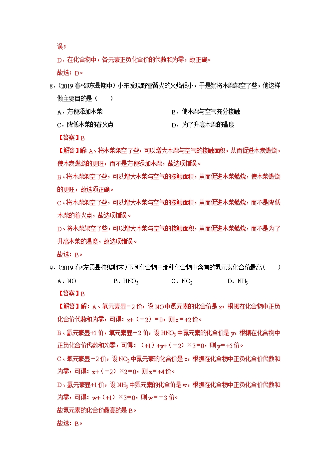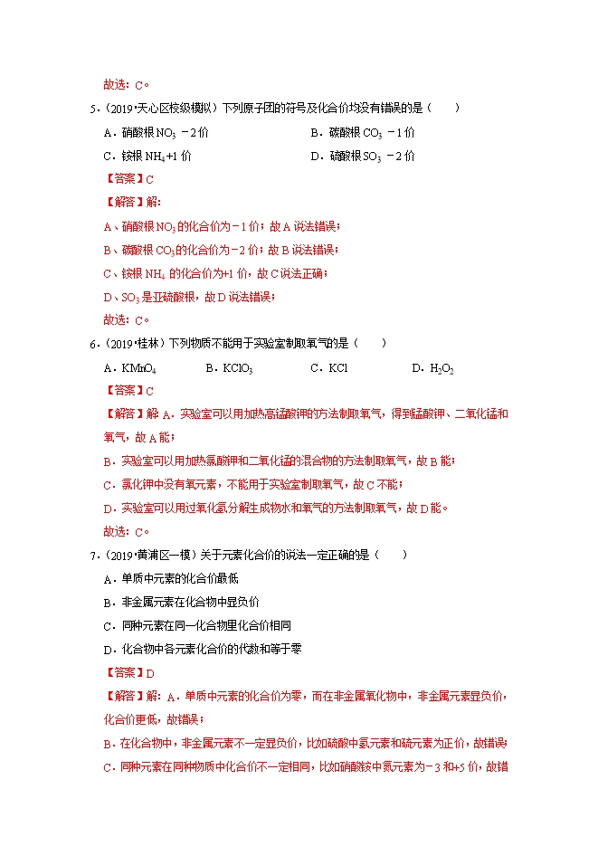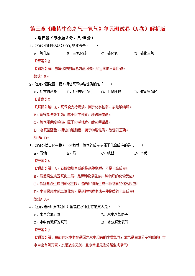 【内容简介】描述氧气物理性质的是( )A.能支持燃烧B.能使铁生锈C.供给呼吸D.液氧呈蓝色【答案】D【解答】解:A、氧气能支持燃烧,属于化学性质,故选项错误。B、氧气能使铁生锈,属于化学性质,故选项错误。C、氧气能供给呼吸,属于化学性质,故选项错误。D、液氧呈蓝色,描述的是颜色,属于物理性质,故选项正确。故选:D。3.(2019•博山区一模)下列物质与氧气的反应不属于化合反应的是( )A.石蜡B.磷C.铁丝D.木炭【答案】A【解答】解:A、石蜡燃烧生成的是两种物质,不是化合反应;B、磷燃烧生成五氧化二磷,是两种物质生成一种物质的化合反应;C、铁丝燃烧生成四氧化三铁,是两种物质生成一种物质的化合反应;D、木炭燃烧生成二氧化碳,是两种物质生成一种物质的化合反应;故选:A。4.(2019春•沂源县期中)鱼能在水中生存的原因是( )A.水中含氧元素B.水中含氧原子C.水中有溶解的氧气D.水分解出氧气【答案】C【解答】解:鱼能在水中生存是因为水中溶有的少量氧气,氧气是由氧分子构成的;与水中含有氧元素、水是液态无关,且水常温无法分解生成氧气;......