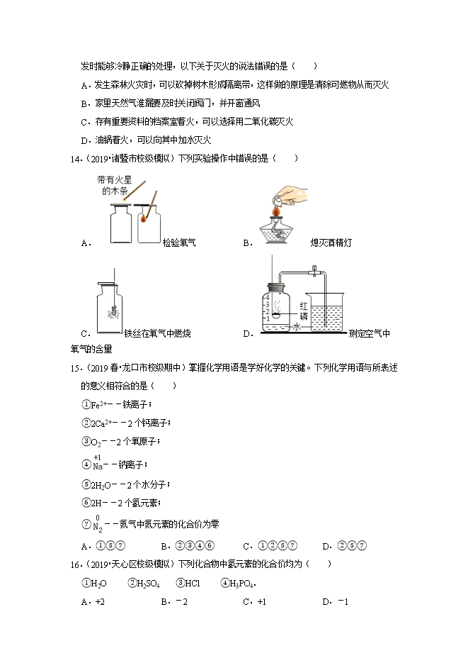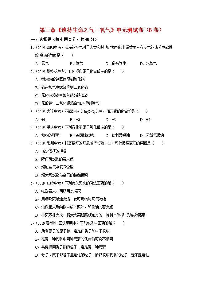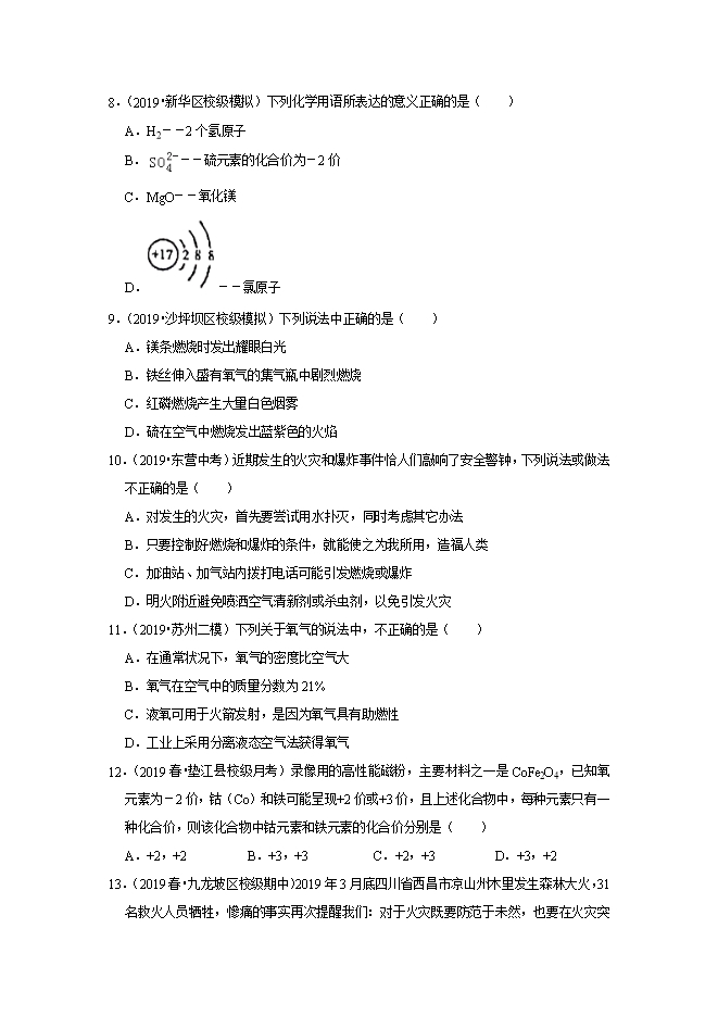 【内容简介】洁净的空气对于人类和其他动植物都非常重要。在空气的成分中能供给呼吸的气体是( )A.氮气B.氧气C.稀有气体D.水蒸气2.(2019•攀枝花中考)下列反应属于化合反应的是( )A.煅烧碳酸钙固体得到氧化钙B.硫在氧气中燃烧得到二氧化硫C.氯化钠溶液中加入硝酸银溶液D.氯酸钾与二氧化锰混合加热得到氧气3.(2019•大连中考)亚硒酸钠(Na2SeO3)中,硒元素的化合价是( )A.+1B.+2C.+3D.+44.(2019•重庆中考)下列变化不属于氧化反应的是( )A.动物的呼吸B.盐酸除铁锈C.铁制品锈蚀D.天然气燃烧5.(2019•常州中考)将酒精灯的灯芯拨得松散一些,可使燃烧更旺的原因是( )A.减少酒精的挥发B.降低可燃物的着火点C.增加空气中氧气含量D.增大可燃物与空气的接触面积6.(2019•铁岭中考)下列有关灭火的说法正确的是( )A.电器着火,可以用水浇灭B.用嘴吹灭蜡烛火焰,使可燃物与氧气隔绝C.油锅起火后向锅中放入菜叶,降低油的着火点D.扑灭森林火灾,将大火蔓延路线前方的一片树木砍掉,形成隔离带7.(2019春•合川区校级期中)下列说法中正确的是( )A.所有原子的原子核一定是由质子和中子构成......