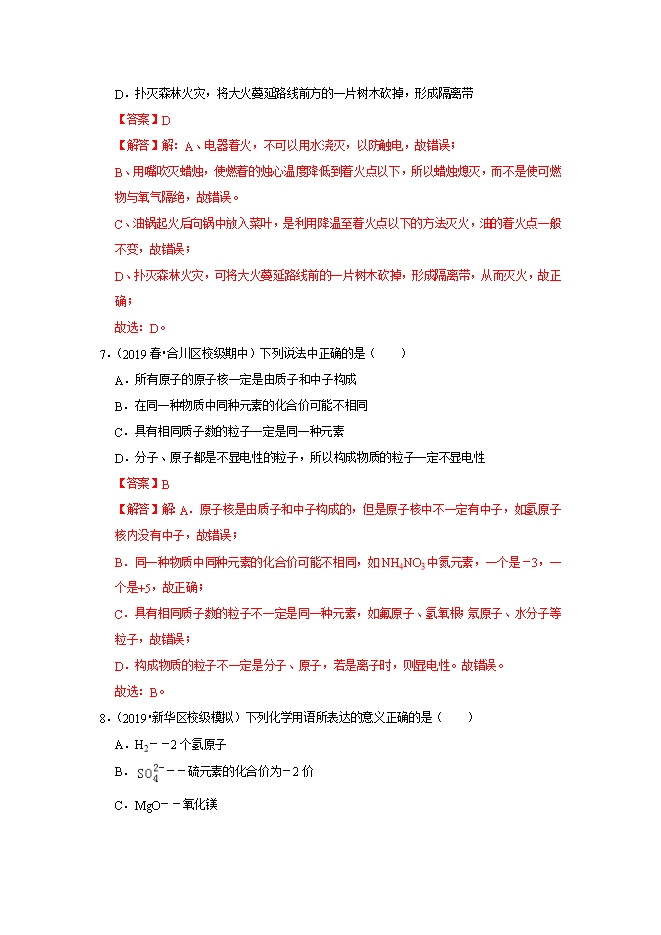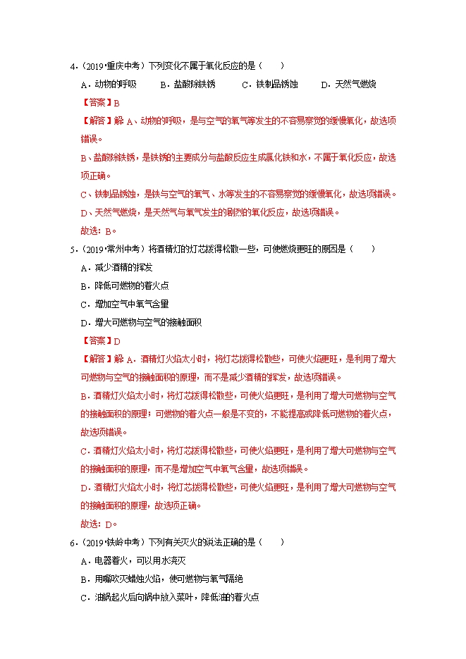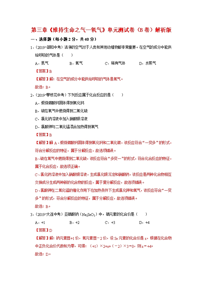 【内容简介】洁净的空气对于人类和其他动植物都非常重要。在空气的成分中能供给呼吸的气体是( )A.氮气B.氧气C.稀有气体D.水蒸气【答案】B【解答】解:在空气的成分中能供给呼吸的气体是氧气。故选:B。2.(2019•攀枝花中考)下列反应属于化合反应的是( )A.煅烧碳酸钙固体得到氧化钙B.硫在氧气中燃烧得到二氧化硫C.氯化钠溶液中加入硝酸银溶液D.氯酸钾与二氧化锰混合加热得到氧气【答案】B【解答】解:A、煅烧碳酸钙固体得到氧化钙和二氧化碳,该反应符合“一变多”的形式,符合分解反应的特征,属于分解反应,故选项错误。B、硫在氧气中燃烧得到二氧化硫,该反应符合“多变一”的形式,符合化合反应的特征,属于化合反应,故选项正确。C、氯化钠溶液中加入硝酸银溶液,生成氯化银沉淀和硝酸钠,该反应是两种化合物相互交换成分生成两种新的化合物的反应,属于复分解反应,故选项错误。D、氯酸钾在二氧化锰的催化作用下在加热条件下生成氯化钾和氧气,该反应符合“一变多”的形式,符合分解反应的特征,属于分解反应,故选项错误。故选:B。3.(2019•大连中考)亚硒酸钠(Na2SeO3)中,硒元素的化合价是( )A.+1B.+2C.+3D.+4【答案】D【解答】解:钠元素显+1价,氧元素显﹣2价,设Se元素的化合价是x,根据在化合物中正负化合价代数和为零,可得:(+1)×2+x+(﹣2)×3=0,则x=+4。故选:D。......