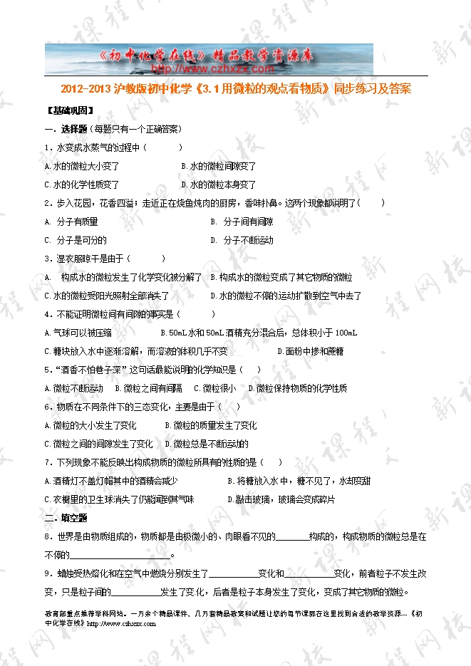 2012-2013沪教版初中化学《3.1构成物质的基本微粒》同步练习及答案