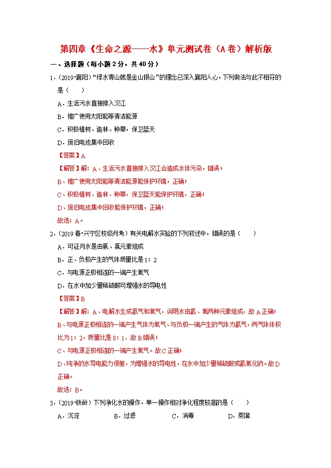 2020届科粤版九年级化学《第4章 生命之源——水》同步单元双基双测“AB”卷(A卷)(word版含答案解析)