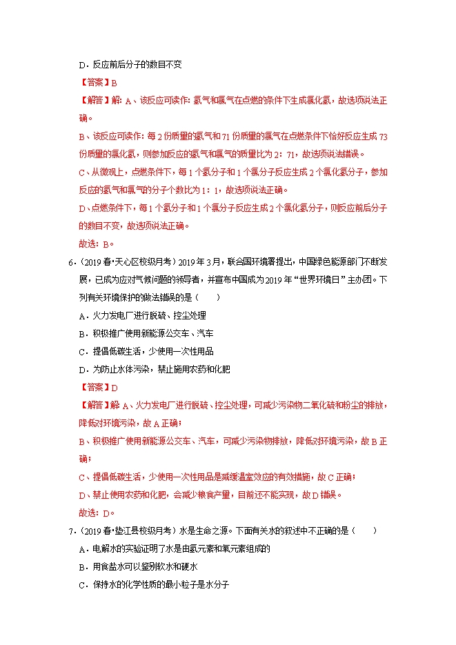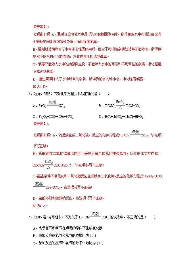 【内容简介】有关电解水实验的下列叙述中,错误的是( )A.可证月水是由氨、氯元素组成B.正、负极产生的气体质量比是1:2C.与电源正极相连的一端产生氧气D.在水中加少量稀硫酸可增强水的导电性【答案】B【解答】解:A、电解水生成氢气和氧气,说明水由氢、氧两种元素组成,故A正确;B、与电源正极相连的一端产生气体为氧气、与负极一端产生的气体为氢气,两气体体积比为1:2,质量比是8:1.故B错误;C、与电源正极相连的一端产生氧气。故C正确;D、纯净的水导电能力很差,为增强水的导电性,在水中加少量稀硫酸或氢氧化钠。故D正确。故选:B。3.(2019•铁岭)下列净化水的操作,单一操作相对净化程度较高的是( )A.沉淀B.过滤C.消毒D.蒸馏【答案】D【解答】解:A、通过沉淀可使水中悬浮的大颗粒固体沉降,所得到的水中可能还会含有小颗粒的固体及可溶性杂质,净化程度不高。B、通过过滤而除去了水中不溶性固体杂质,但对于可溶性杂质过滤并不能除去,所得到的水中仍含有可溶性杂质,净化程度不能达到最高。C、消毒只能除去水中的病原微生物,不能除去水中的可溶和不可溶性的杂质,净化程度不能达到最高。D、通过蒸馏除去了水中所有的杂质,所得到的水为纯净物,净化程度最高。故选:D。4.(2019•邵阳)下列化学方程式书写正确的是( )A.S+O2 SO2B.2KClO3 2KCl+3O2C.Fe2O3+3CO═2Fe+3CO2D.HCl+NaNO3═NaCl+HNO3【答案】A【解答】解:A、硫燃烧生成二氧化硫,反应的化学方程式:S+O2 SO2,该选项书写正确;B、氯酸钾在二氧化锰催化作用下受热分解生成氯化钾和氧气,反应的化学方程式:2KClO3 2KCl+3O2↑,该选项书写不正确;C、高温条件下氧化铁和一氧化碳反应生成铁和二氧化碳,反应的化学方程式:Fe2O3+3CO 2Fe+3CO2,该选项书写不正确;D、盐酸不能和硝酸钠反应,该选项书写不正确。故选:A。......