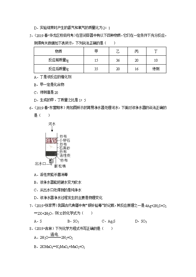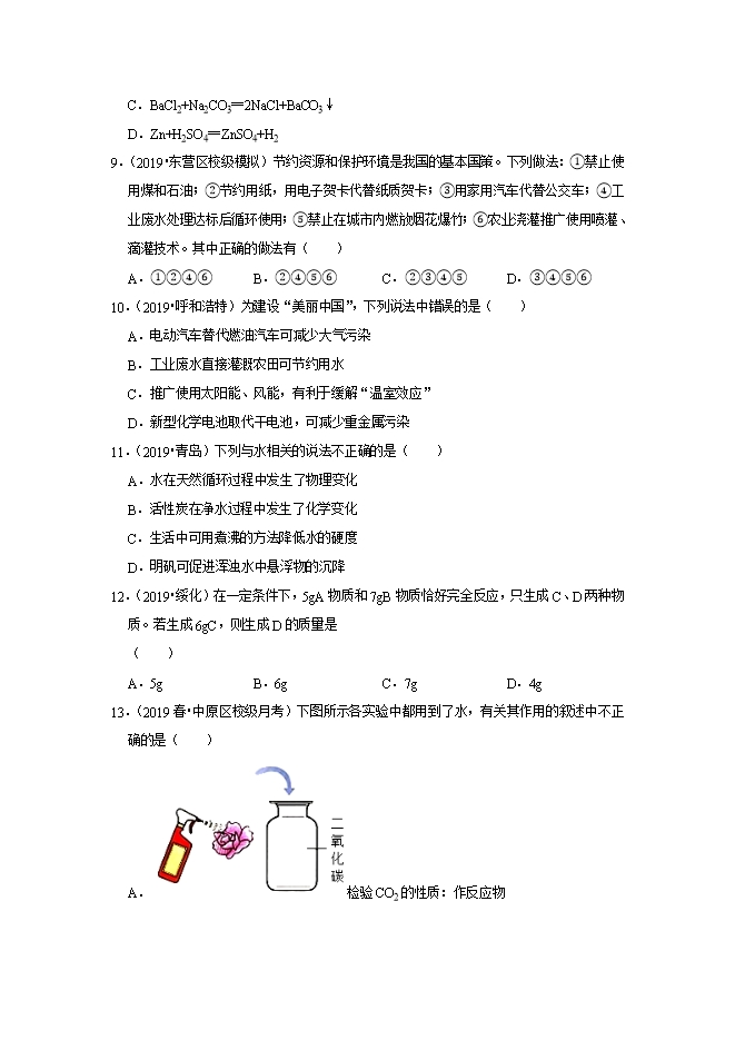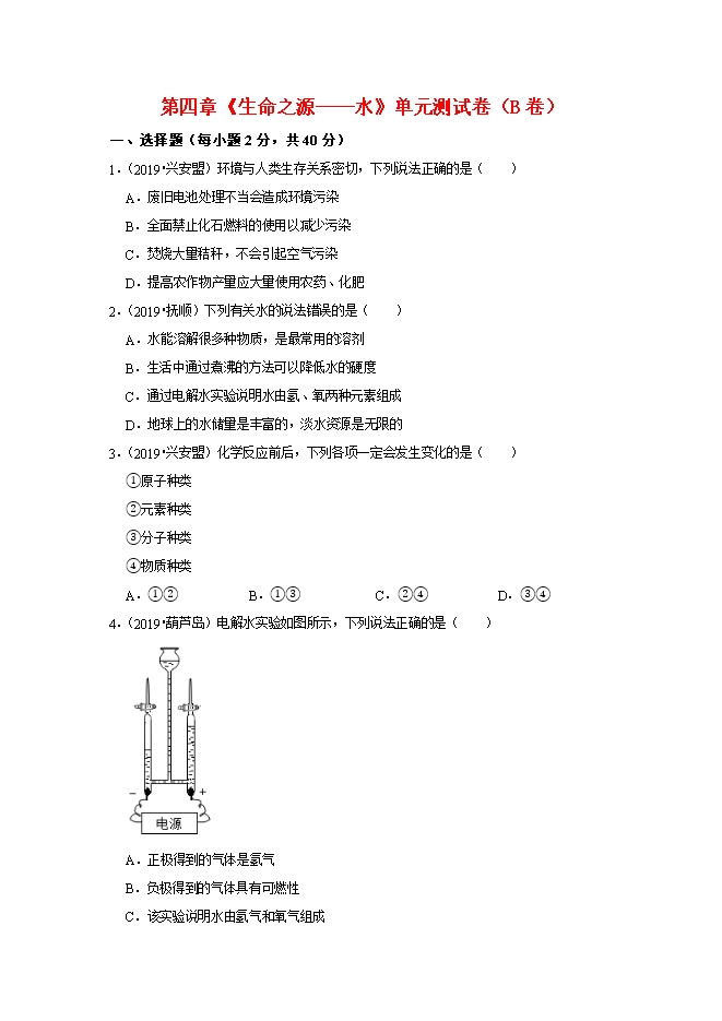 【内容简介】环境与人类生存关系密切,下列说法正确的是( )A.废旧电池处理不当会造成环境污染B.全面禁止化石燃料的使用以减少污染C.焚烧大量秸秆,不会引起空气污染D.提高农作物产量应大量使用农药、化肥2.(2019•抚顺)下列有关水的说法错误的是( )A.水能溶解很多种物质,是最常用的溶剂B.生活中通过煮沸的方法可以降低水的硬度C.通过电解水实验说明水由氢、氧两种元素组成D.地球上的水储量是丰富的,淡水资源是无限的3.(2019•兴安盟)化学反应前后,下列各项一定会发生变化的是( )①原子种类②元素种类③分子种类④物质种类A.①②B.①③C.②④D.③④4.(2019•葫芦岛)电解水实验如图所示,下列说法正确的是( )......