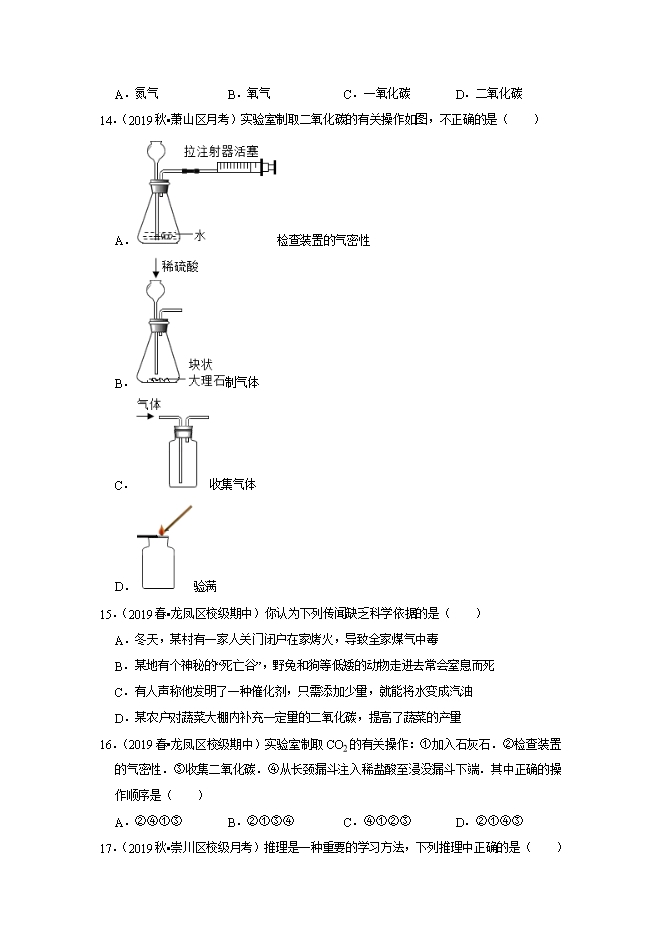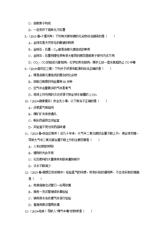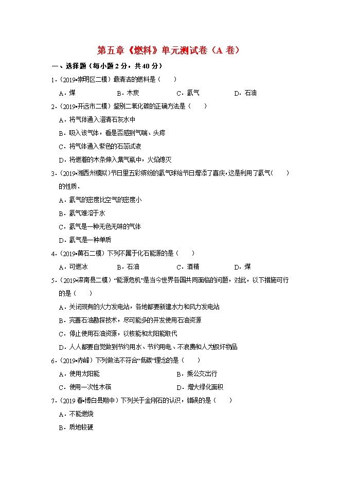 【内容简介】最清洁的燃料是( )A.煤B.木炭C.氢气D.石油2.(2019•开远市二模)鉴别二氧化碳的正确方法是( )A.将气体通入澄清石灰水中B.吸入该气体,看是否感到气喘、头疼C.将气体通入紫色的石蕊试液D.将燃着的木条伸入集气瓶中,火焰熄灭3.(2019•湘西州模拟)节日里五彩缤纷的氢气球给节日增添了喜庆,这是利用了氢气( )的性质.A.氢气的密度比空气的密度小B.氢气难溶于水C.氢气是一种无色无味的气体D.氢气是一种单质4.(2019•黄石二模)下列不属于化石能源的是( )A.可燃冰B.石油C.酒精D.煤5.(2019•滦南县二模)“能源危机”是当今世界各国共同面临的问题,对此,以下措施可行的是( )A.关闭现有的火力发电站,各地都要新建水力和风力发电站B.完善石油勘探技术,尽可能多的开发使用石油资源C.停止使用石油资源,以核能和太阳能取代D.人人都要自觉做到节约用水、节约用电、不浪费和人为毁坏物品......
