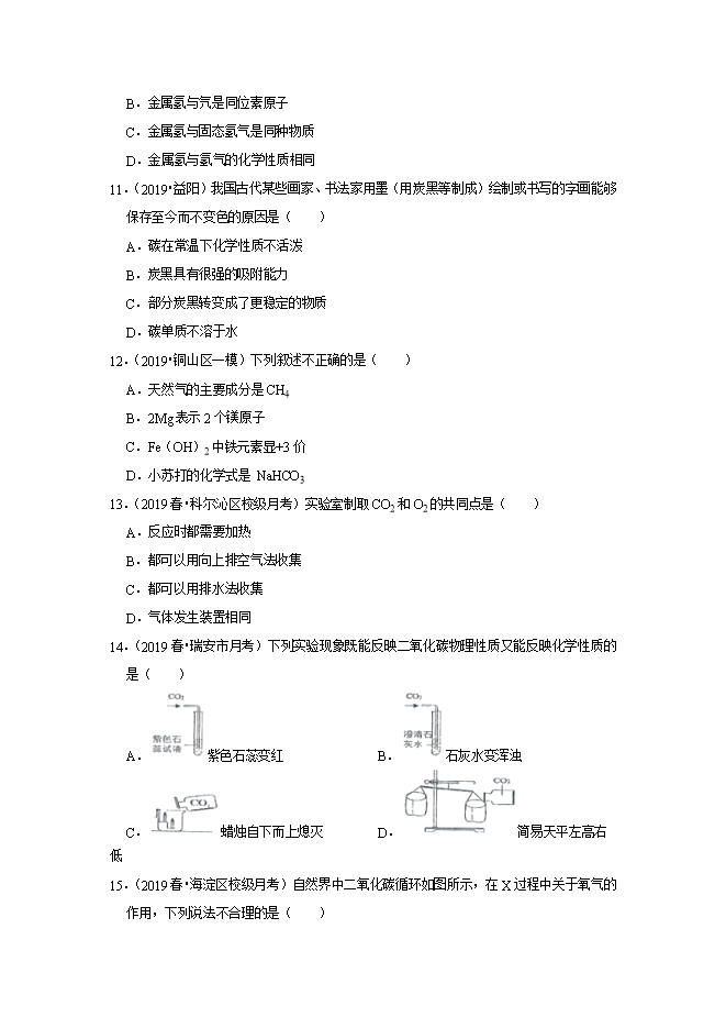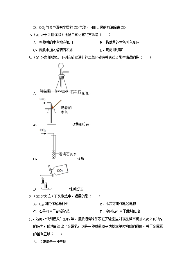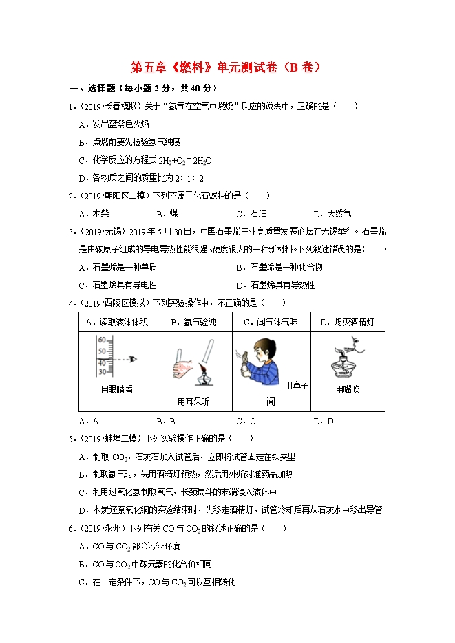 【内容简介】关于“氢气在空气中燃烧”反应的说法中,正确的是( )A.发出蓝紫色火焰B.点燃前要先检验氢气纯度C.化学反应的方程式2H2+O2=2H2OD.各物质之间的质量比为2:1:22.(2019•朝阳区二模)下列不属于化石燃料的是( )A.木柴B.煤C.石油D.天然气3.(2019•无锡)2019年5月30日,中国石墨烯产业高质量发展论坛在无锡举行。石墨烯是由碳原子组成的导电导热性能很强、硬度很大的一种新材料。下列叙述错误的是( )A.石墨烯是一种单质B.石墨烯是一种化合物C.石墨烯具有导电性D.石墨烯具有导热性4.(2019•西陵区模拟)下列实验操作中,不正确的是( )A.读取液体体积B.氢气验纯C.闻气体气味D.熄灭酒精灯 用眼睛看 用耳朵听 用鼻子闻 用嘴吹A.AB.BC.CD.D5.(2019•蚌埠二模)下列实验操作正确的是( )A.制取 CO2,石灰石加入试管后,立即将试管固定在铁夹里B.制取氢气时,先用酒精灯预热,然后用外焰对准药品加热C.利用过氧化氢制取氧气,长颈漏斗的末端浸入液体中D.木炭还原氧化铜的实验结束时,先移走酒精灯,试管冷却后再从石灰水中移出导管6.(2019•永州)下列有关CO与CO2的叙述正确的是( )........
