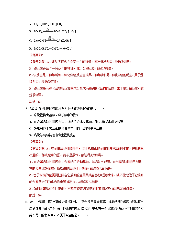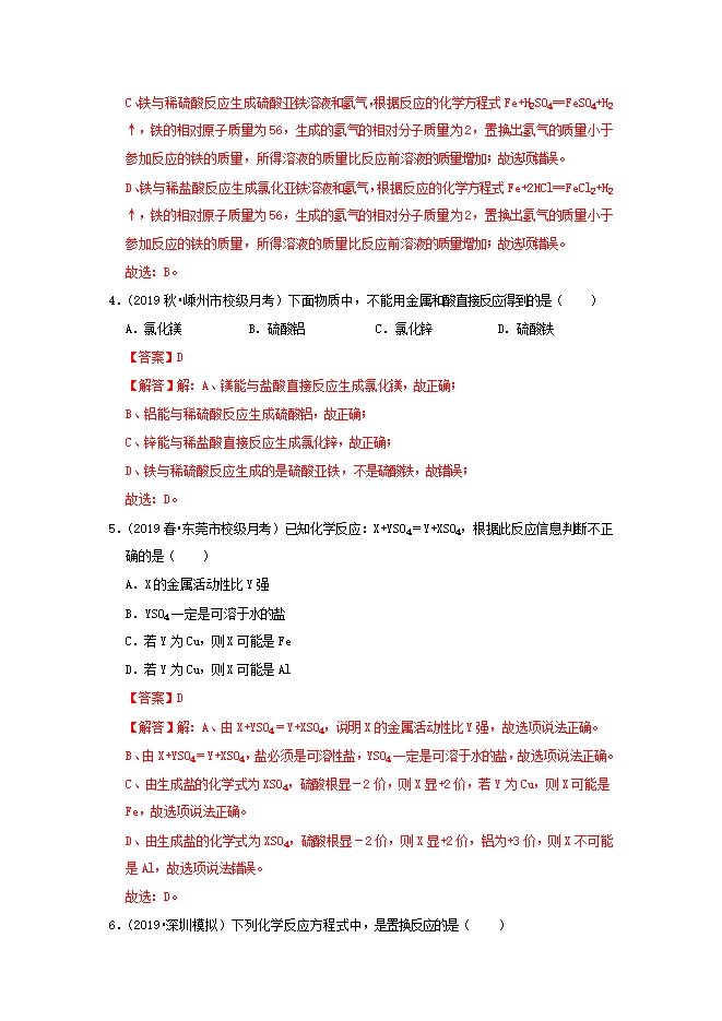 【内容简介】在自然界中以游离态存在的金属元素是( )A.金B.镁C.铝D.铁【答案】A【解答】解:地球上的金属资源广泛地存在于地壳和浩瀚的海洋中,除少量很不活泼的金属,如金、银等有单质形式存在外,其余都以化合物形式存在。A、金是在自然界中能以游离态存在的金属元素,故选项正确。B、镁在自然界中能以化合态存在,故选项错误。C、铝在自然界中能以化合态存在,故选项错误。D、铁在自然界中能以化合态存在,故选项错误。故选:A。2.(2019•贵定县二模)白炽灯泡里用的是钨丝,因为钨是( )A.熔点最高的金属B.导电、导热性最好的金属材料C.延展性最好的金属D.容易冶炼、价格低廉的金属材料【答案】A【解答】解:用钨做灯丝是因为钨熔点高、耐高温。故选:A。3.(2019春•茂名月考)把铁片放入下列液体中反应,液体的质量比反应前减少的是( )A.Zn(NO3)2溶液B.CuSO4溶液C.H2SO4溶液D.HCl溶液【答案】B【解答】解:A、铁恶金属活动性比锌弱,不能与硝酸锌溶液发生置换反应,液体的质量不变,故选项错误。B、铁与硫酸铜溶液反应生成硫酸亚铁溶液和铜,根据反应的化学方程式Fe+CuSO4═FeSO4+Cu,铁的相对原子质量为56,生成的铜的相对原子质量为64,置换出铜的质量大于参加反应的铁的质量,所得溶液的质量比反应前溶液的质量减小;故选项正确。......