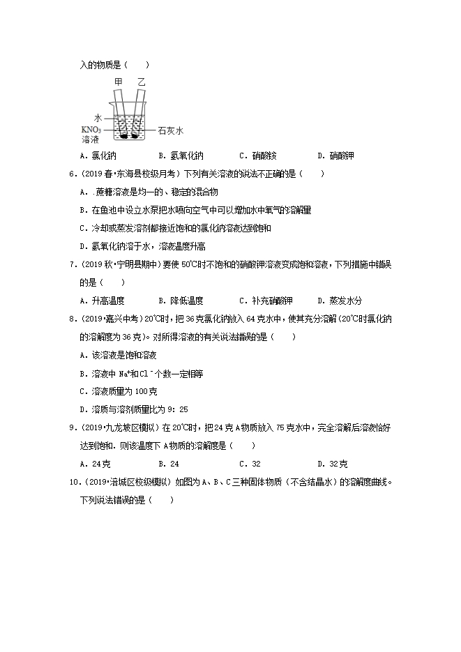 【内容简介】下列属于乳化现象的是( )A.碘溶于酒精中B.用汽油洗去机器上的油污C.用洗洁精洗去碗上的油渍D.用水洗去衣服上的污渍3.(2019秋•拱墅区校级月考)向如图装置的试管中加入某种物质后,U形管右边支管的红墨水液面降低,左边支管的红墨水液面上升,则加入的物质是( ) A.氢氧化钠B.浓硫酸C.氯化钠D.硝酸铵4.(2019•朝阳中考)下列关于溶液的叙述错误的是( )A.溶液一定是混合物B.碘酒是一种溶液,其中溶剂是酒精C.一定温度下,某物质的饱和溶液不能再溶解其他任何物质D.固态氢氧化钠溶于水溶液温度升高5.(2019•翁牛特旗校级模拟)如图所示,在盛冷水烧杯中放入甲、乙两支试管(试管中都有未溶解的该溶液的溶质),若使甲试管中晶体减少,乙试管中晶体增加,需向烧杯中加入的物质是( ) A.氯化钠B.氢氧化钠C.硝酸铵D.硝酸钾6.(2019春•东海县校级月考)下列有关溶液的说法不正确的是( )A..蔗糖溶液是均一的、稳定的混合物B.在鱼池中设立水泵把水喷向空气中可以增加水中氧气的溶解量C.冷却或蒸发溶剂都接近饱和的氯化钠溶液达到饱和D.氢氧化钠溶于水,溶液温度升高.....
