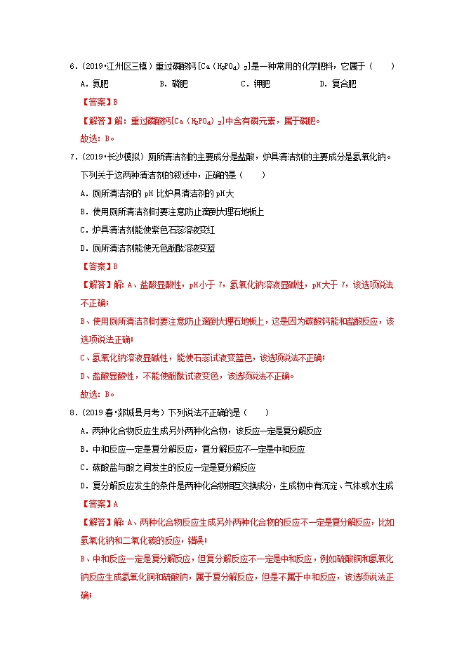 2020届科粤版九年级化学《第8章 常见的酸碱盐》同步单元双基双测“AB”卷(A卷)(word版含答案解析)