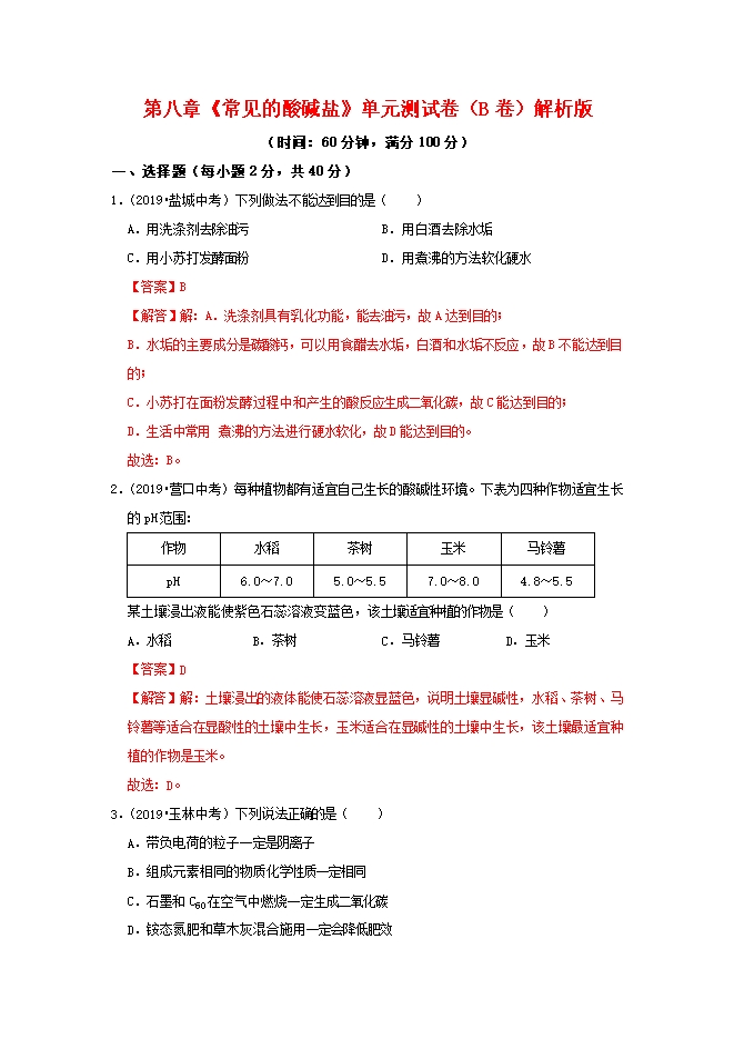 2020届科粤版九年级化学《第8章 常见的酸碱盐》同步单元双基双测“AB”卷(B卷)(word版含答案解析)