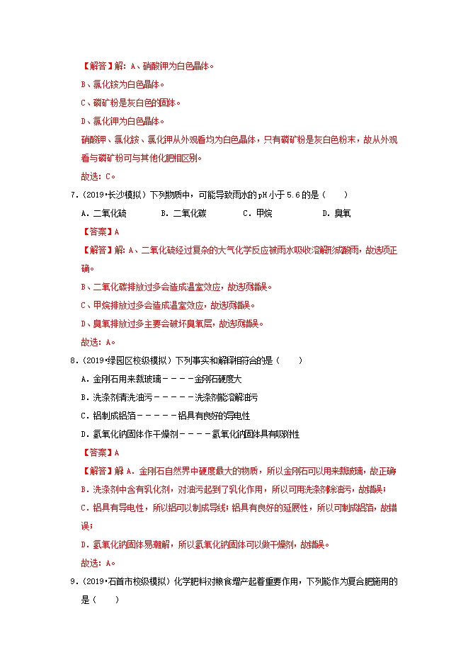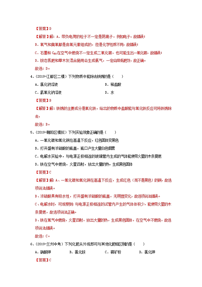 【内容简介】下列说法正确的是( )A.带负电荷的粒子一定是阴离子B.组成元素相同的物质化学性质一定相同C.石墨和C60在空气中燃烧一定生成二氧化碳D.铵态氮肥和草木灰混合施用一定会降低肥效【答案】D【解答】解:A.带负电荷的粒子不一定是阴离子,例如电子,故错误;B.氧气和臭氧都是由氧元素组成的,但是化学性质不同,故错误;C.石墨和C60在空气中燃烧不一定生成二氧化碳,也可能生出一氧化碳,故错误;D.铵态氮肥和草木灰混合施用会生成氨气,一定会降低肥效,故正确。故选:D。4.(2019•江都区二模)下列物质中能除去铁锈的是( )A.氯化钠溶液B.稀盐酸C.氢氧化钠溶液D.水【答案】B【解答】解:铁锈的主要成分是氧化铁,给出的物质中盐酸能与氧化铁反应可将铁锈除去,故选:B。5.(2019•潮阳区模拟)下列实验现象正确的是( )A.一氧化碳和氧化铜在高温下反应,红色固体变黑色B.打开盛有浓硫酸的瓶盖,瓶口产生大量白色烟雾C.电解水实验中,与电源正极相连的玻璃管内生成的气体能使带火星的木条复燃D.铁在空气中燃烧,火星四射,放出大量的热,生成黑色固体【答案】C【解答】解:A、一氧化碳和氧化铜在高温下反应,生成红色(而不是黑色)的铜,故选项说法错误。B、浓硫酸具有吸水性,打开盛有浓硫酸的瓶盖,无明显变化,故选项说法错误。C、电解水时,可观察到:与电源正极相连的试管内产生的气体体积少,能使带火星的木条复燃,故选项说法正确。D、铁在氧气中燃烧,火星四射,放出大量的热,生成黑色固体,在空气中不燃烧,故选项说法错误。故选:C。......