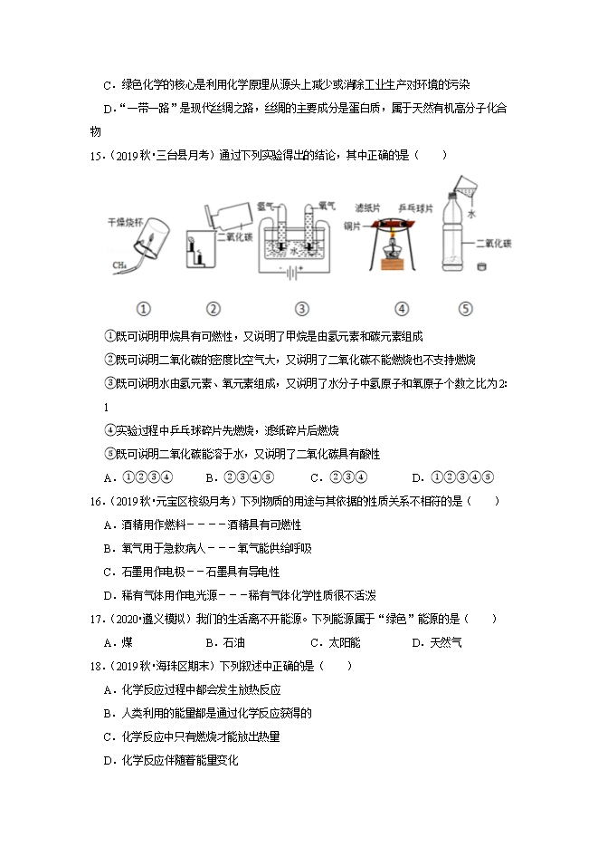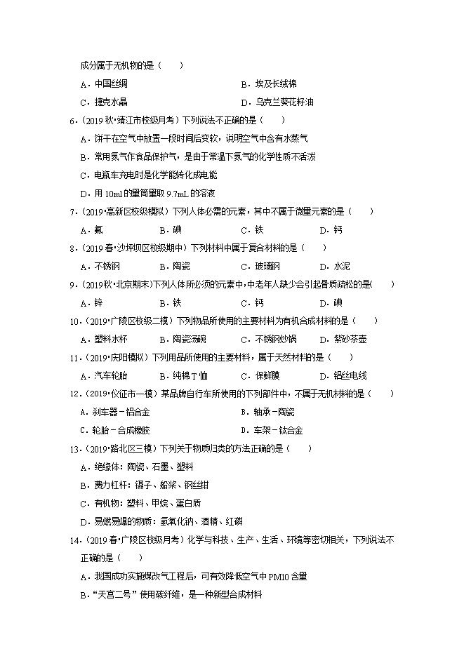 【内容简介】人体中化学元素含量的多少会直接影响人体健康。下列人体所缺元素与引起的健康问题关系错误的是( )A.缺铁会引起贫血B.缺碘会引起龋齿C.缺钙会引起佝偻病D.缺锌会引起食欲不振而导致发育不良2.(2019秋•江都区月考)下列做法不利于节能环保的是( )A.工业废气处理达标排放B.减少使用一次性塑料制品C.提倡使用LED节能路灯D.垃圾露天焚烧3.(2019秋•通山县校级月考)日常生活中,很多问题涉及到化学知识。下列认识正确的是( )A.环保工人在清理深而长的地下污水管道前,可以随便进入B.“绿色食品”是指颜色一定是绿颜色的食品C.有多种物质参加的反应一定是化合反应D.“白色污染”是指某些难以分解的“塑料垃圾”对环境造成的污染4.(2019春•香坊区校级月考)为了备战中考,每天的饮食搭必须营养全面,才能有良好的身体状况来迎接每一个挑战,下列午餐的搭配合理的是( )......
