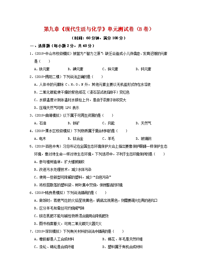 2020届科粤版九年级化学《第9章 现代生活与化学》同步单元双基双测“AB”卷(B卷)(word版无答案)